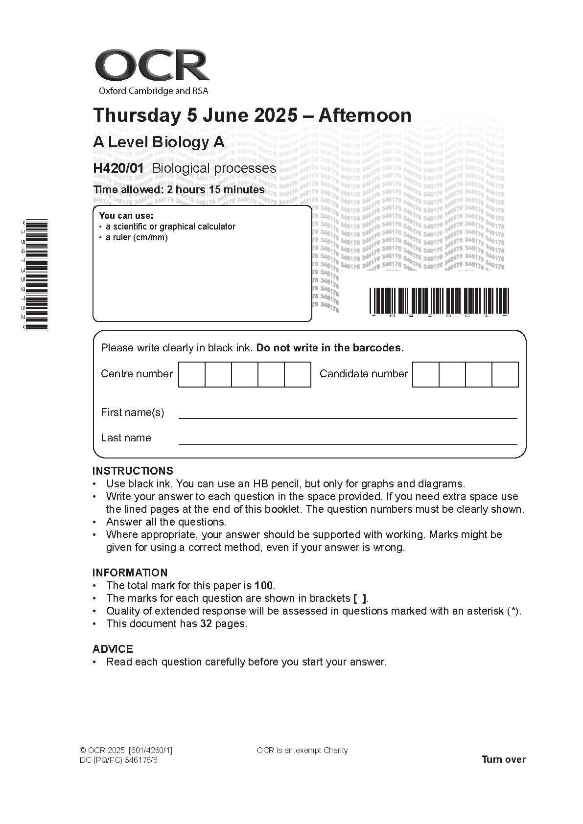 OCR A LEVEL BIOLOGY A PAPER 1 2025 (H420/01: Biological processes). DOWNLOAD this verified paper on www.hackedexams.com and access the PDF INSTANTLY!!!