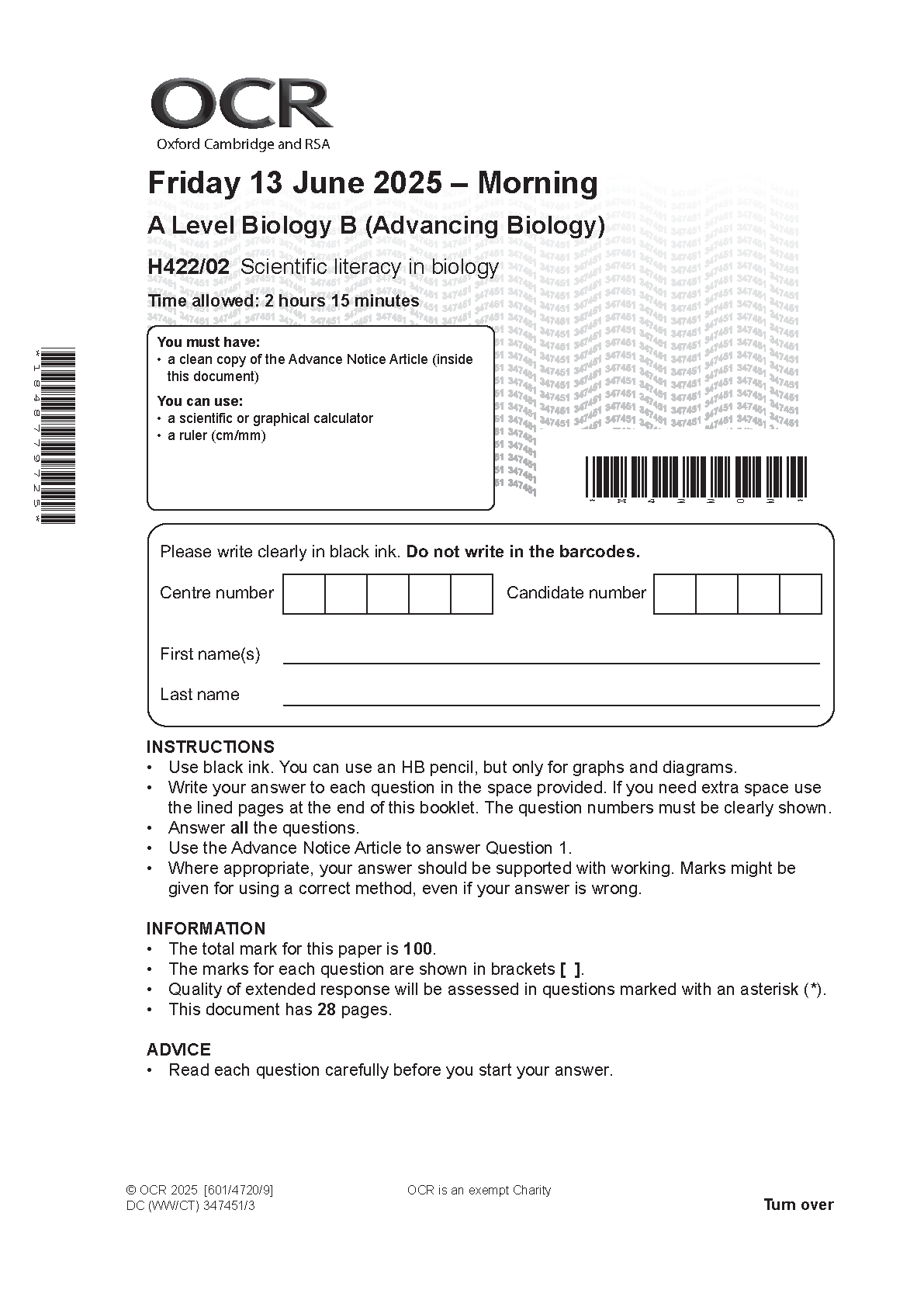 OCR A LEVEL BIOLOGY B PAPER 2 2025 (H422/02: Scientific literacy in biology). DOWNLOAD this verified paper on www.hackedexams.com and access the PDF INSTANTLY!!!