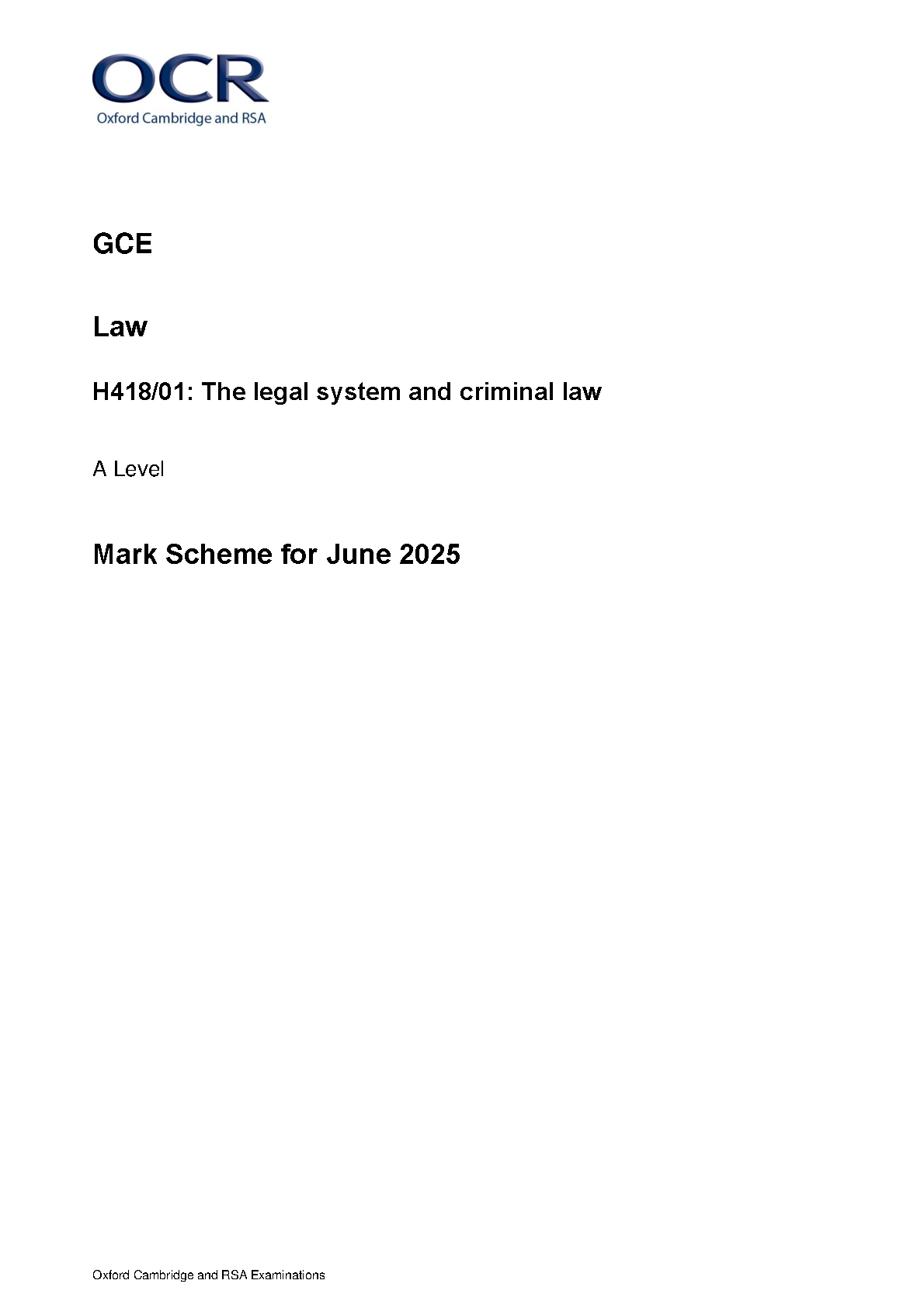 OCR A LEVEL LAW PAPER 1 2025 MARK SCHEME (H418/01: The legal system and criminal law). DOWNLOAD this verified paper on www.hackedexams.com and access the PDF INSTANTLY!!!