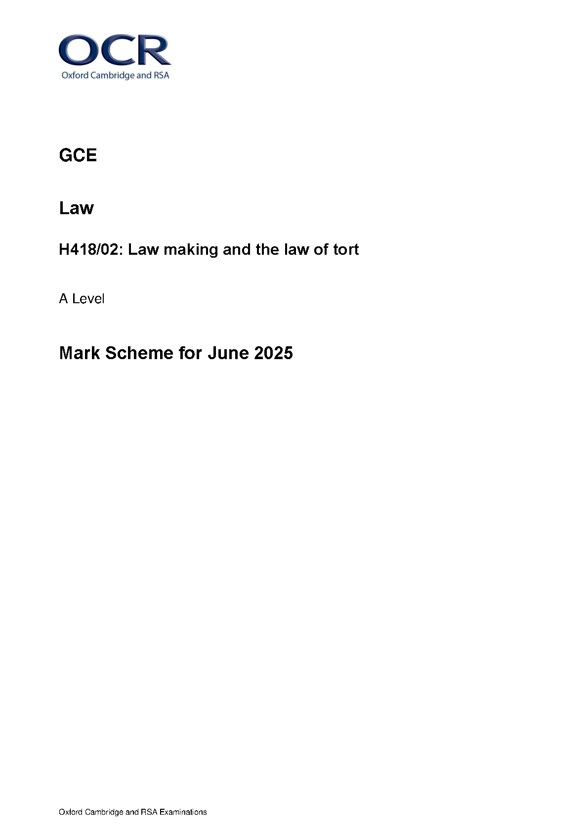 OCR A LEVEL LAW PAPER 2 2025 MARK SCHEME (H418/02: Law making and the law of tort). DOWNLOAD this verified paper on www.hackedexams.com and access the PDF INSTANTLY!!!