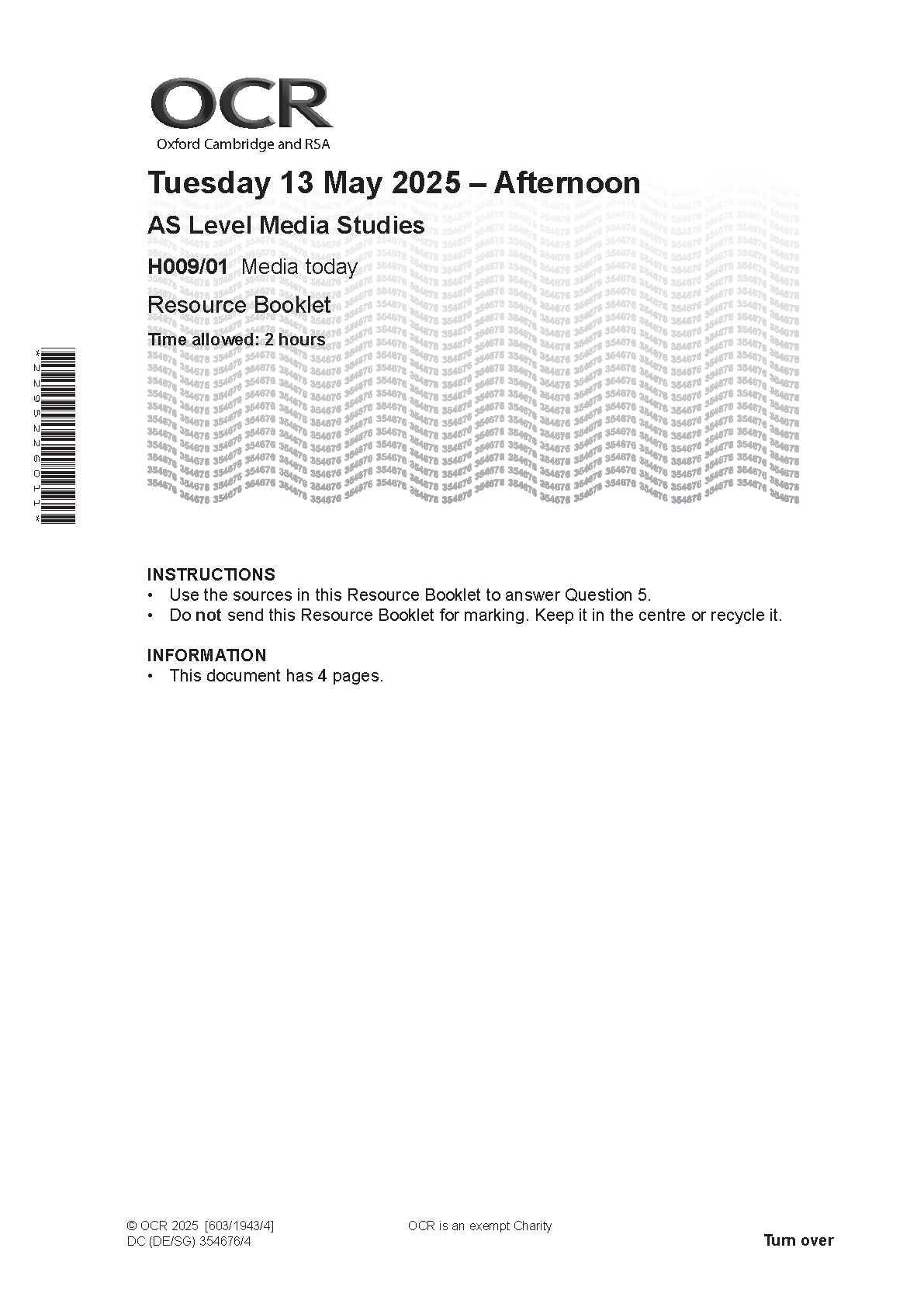 OCR AS MEDIA STUDIES PAPER 1 2025 RESOURCE BOOKLET (H009/01: Media today). DOWNLOAD this verified paper on www.hackedexams.com and access the PDF INSTANTLY!!!