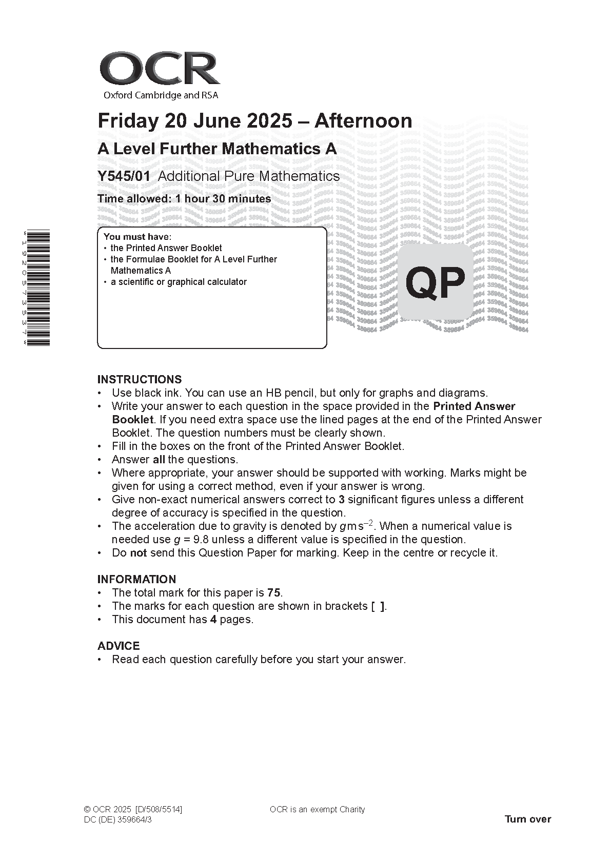 OCR A LEVEL FURTHER MATHEMATICS A PAPER 1 Additional Pure Mathematics 2025 (Y545/01 Additional Pure Mathematics). DOWNLOAD this verified paper on www.hackedexams.com and access the PDF INSTANTLY!!!
