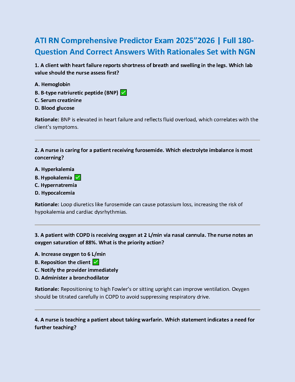 Struggling with the RN ATI Comprehensive Predictor Exam? Our newly updated 2025/2026 study guide is the ultimate tool to guarantee your success. This resource is meticulously designed to cover all essential topics, providing you with the knowledge and confidence to ace the exam on your first try. Say goodbye to the stress of retakes and get ready to achieve your nursing goals. Download now and take the first step towards passing your ATI Comprehensive Assessment with flying colors!