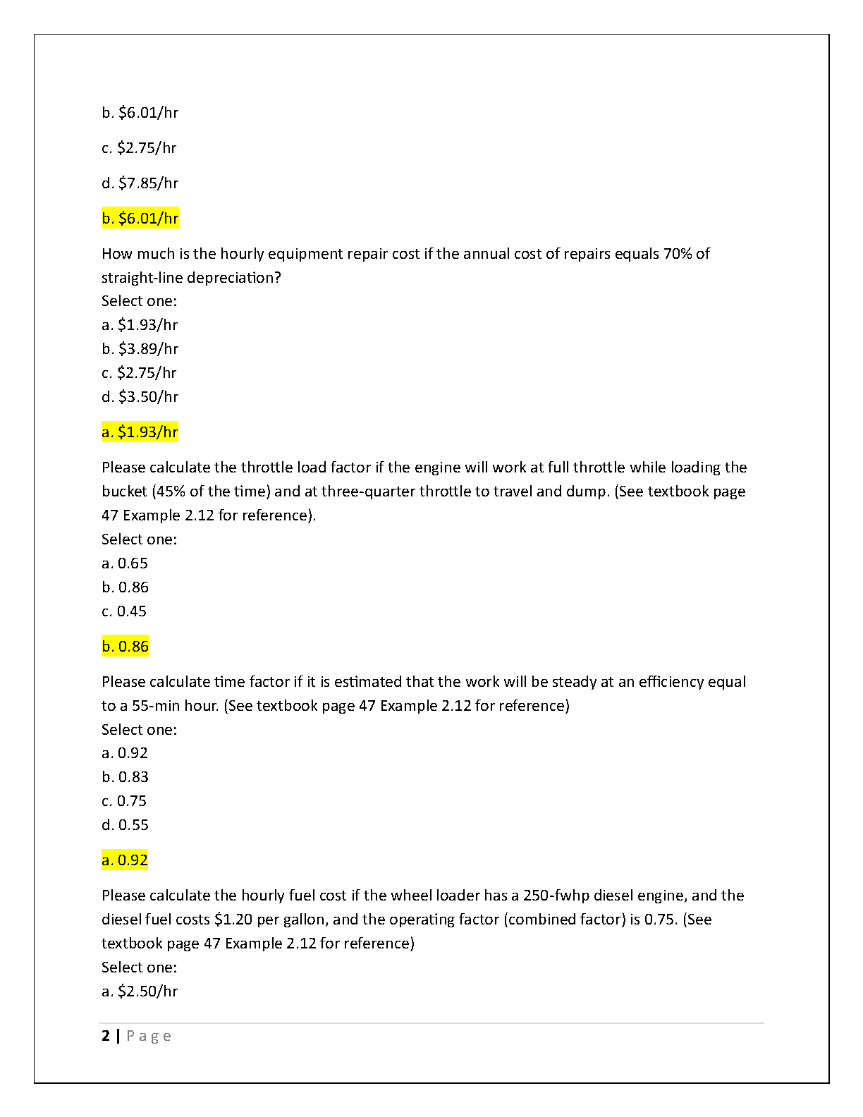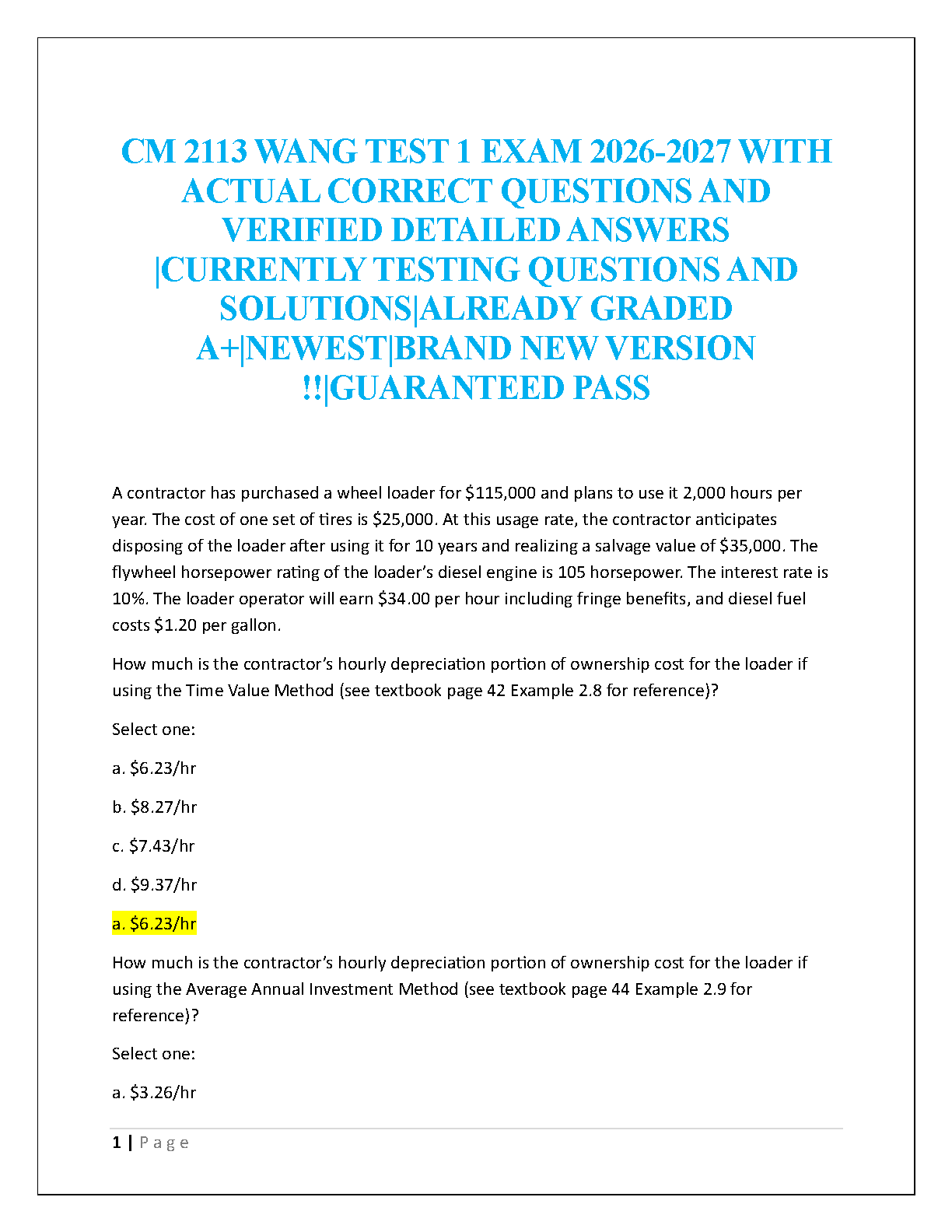Ace your CM 2113 Test 1 with this comprehensive test bank from Professor Wang's course. This essential study guide features a complete collection of actual exam-style questions, each with verified correct answers and detailed solutions. Master complex topics like calculating hourly depreciation and ownership costs for construction equipment. This resource is already graded A+ and is designed to provide you with the exact material you need to pass your exam with confidence and secure a top grade.