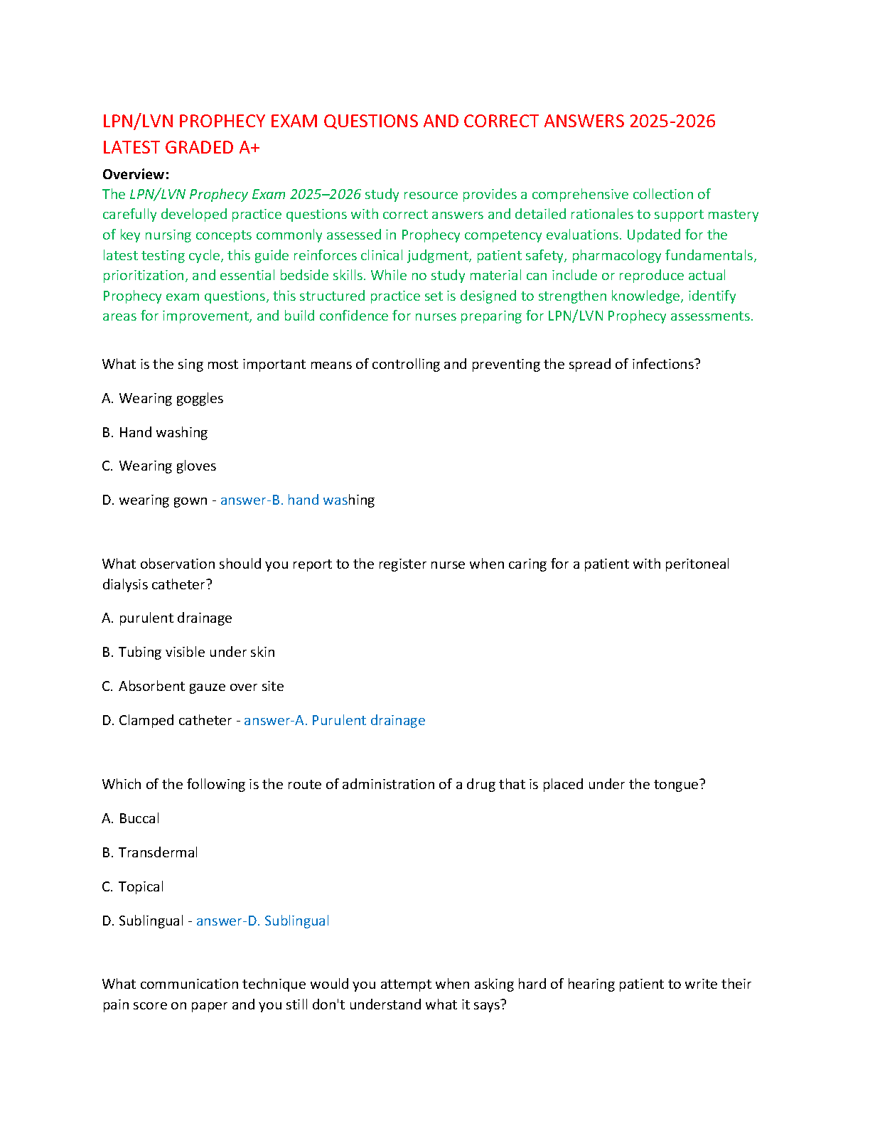 Ace your LPN/LVN Prophecy competency assessment with our ultimate 2025-2026 study guide. This resource is packed with a comprehensive set of practice questions, complete with correct answers and detailed rationales, all graded A+. Updated for the latest exam cycle, it's designed to help you master crucial nursing concepts including clinical judgment, patient safety, pharmacology, and essential bedside skills. Boost your confidence, pinpoint areas for improvement, and pass your LPN/LVN Prophecy exam without the need for resits. Get immediate access to the study material that will put you on the path to success.