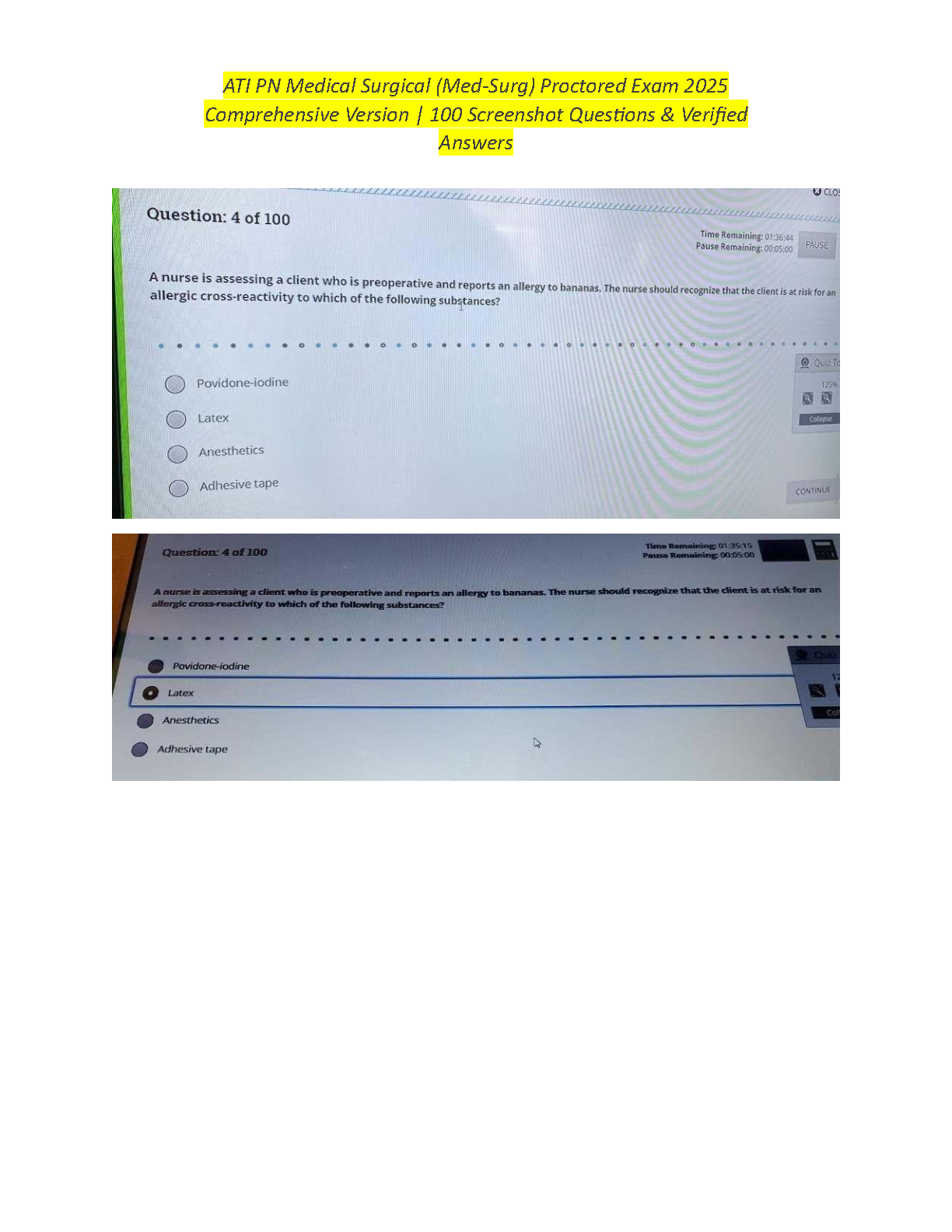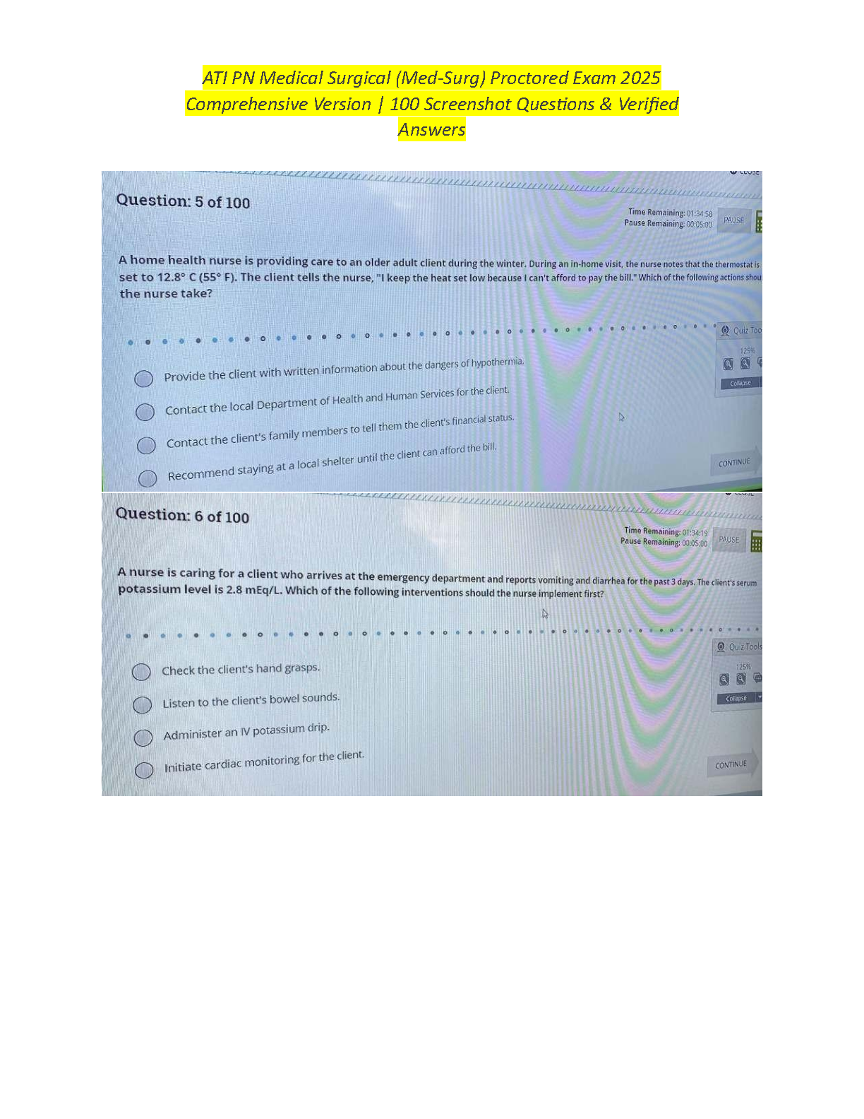 Excel in your nursing studies with the ultimate study guide for the ATI PN Medical-Surgical Proctored Exam, fully updated for the 2025/2026 academic year. This comprehensive test bank features 100 screenshot questions directly from the exam, each with a verified, correct answer. This resource is expertly designed to familiarize you with the actual test format and question types, covering all essential Med-Surg topics. Boost your confidence and knowledge to pass your exam on the very first attempt and take a significant step forward in your nursing career. Avoid resits and master the material with this essential study tool.