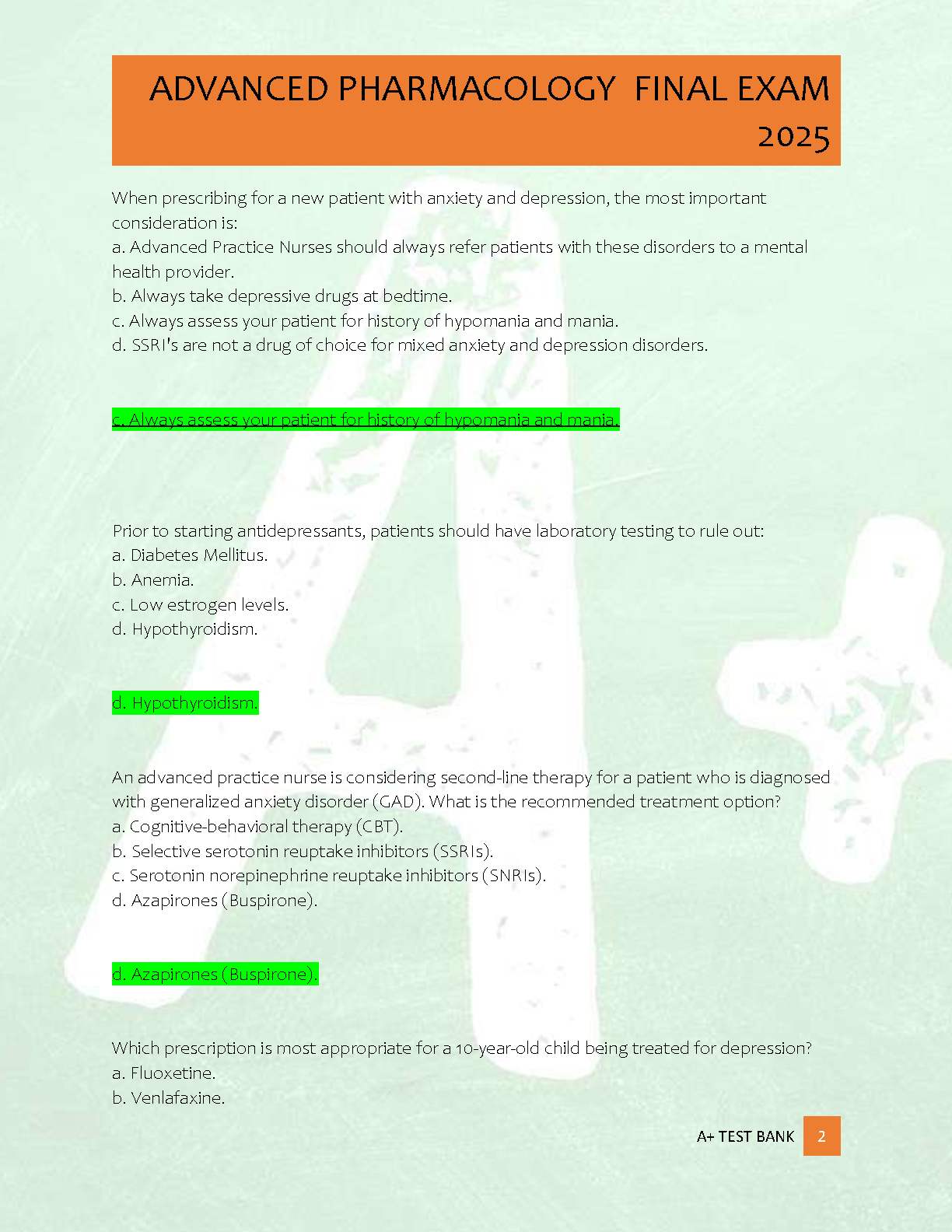 Ace your Advanced Pharmacology final exam with this comprehensive test bank specifically designed for Rasmussen College students for the 2025 academic year. This brand-new, A+ graded resource contains 300 complete questions paired with correct, verified, and detailed answers. Covering all essential topics from the latest Spring/Summer quarter curriculum, this Version 1 exam guide is your ultimate tool for effective preparation. Master the material, understand complex concepts through detailed explanations, and walk into your exam with the confidence to secure a top grade. Download now and start studying smarter!