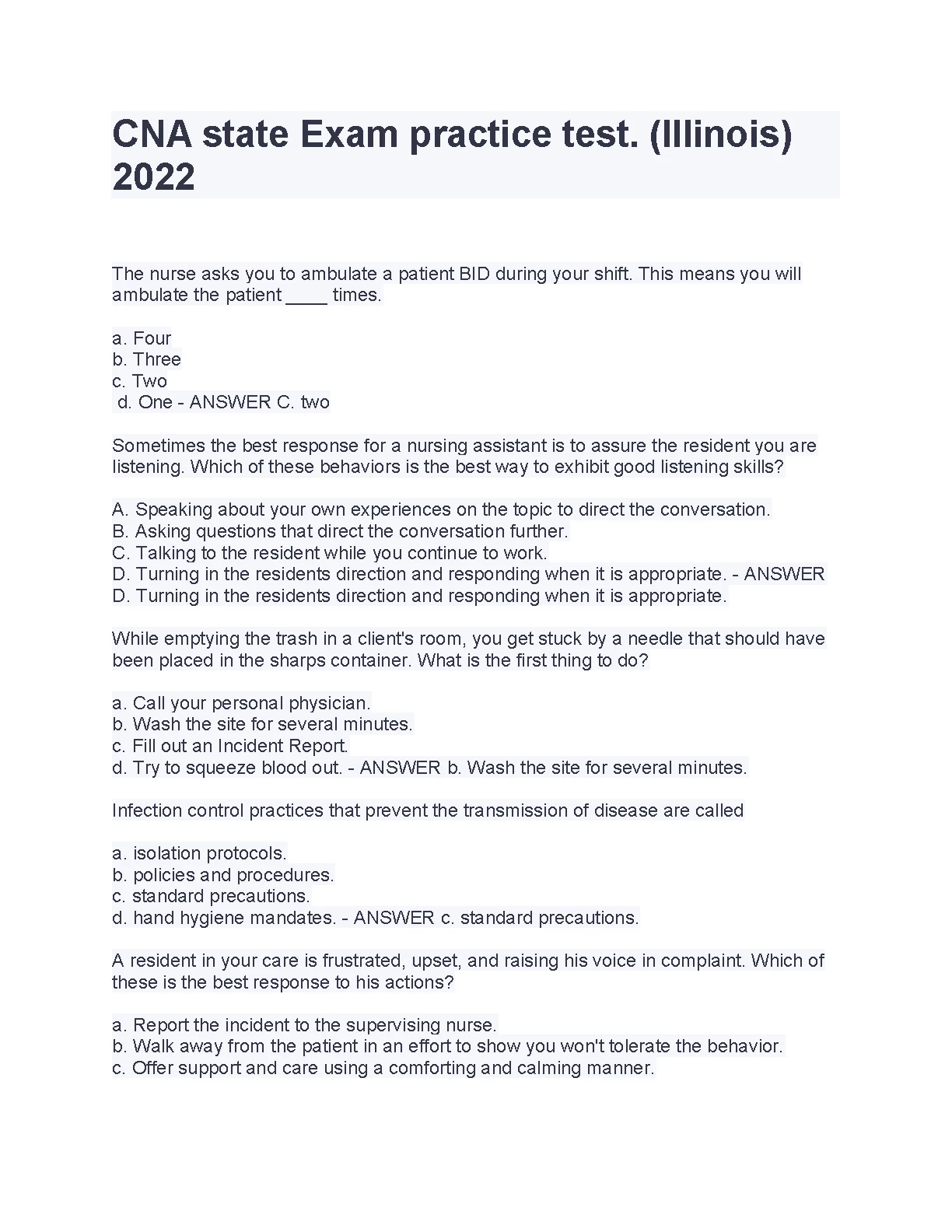 CNA state Exam practice test. (Illinois) 2022/2023. GRADED A+
