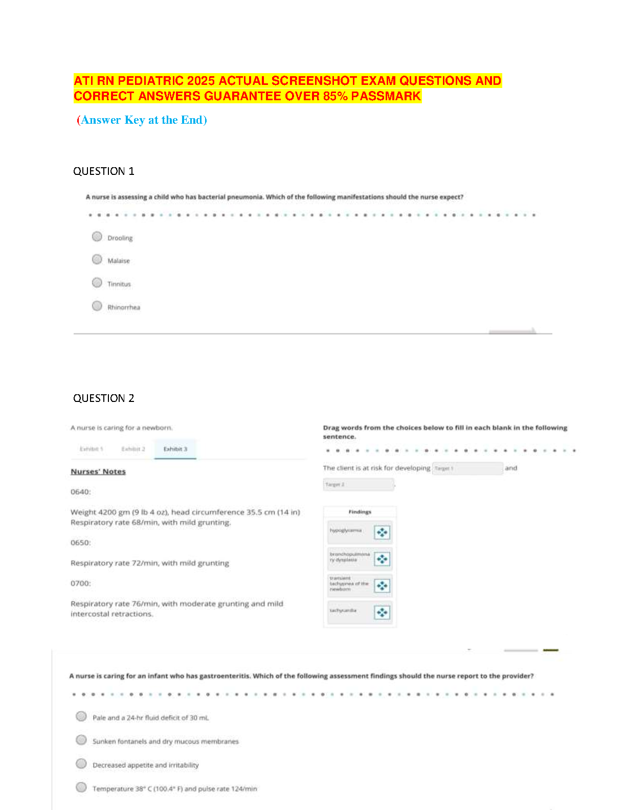 Get ready to ace your pediatric nursing exam with our latest ATI RN Pediatric 2025 Test Bank. This comprehensive study guide features a collection of actual screenshot exam questions, complete with verified correct answers. The material covers critical topics in pediatric care, mirroring the format and difficulty of the real ATI exam. Designed for the 2025/2026 academic year, this resource is your key to mastering the content, boosting your confidence, and achieving a pass mark of over 85% on your first try. Avoid resits and secure your success in pediatric nursing with this essential study tool.