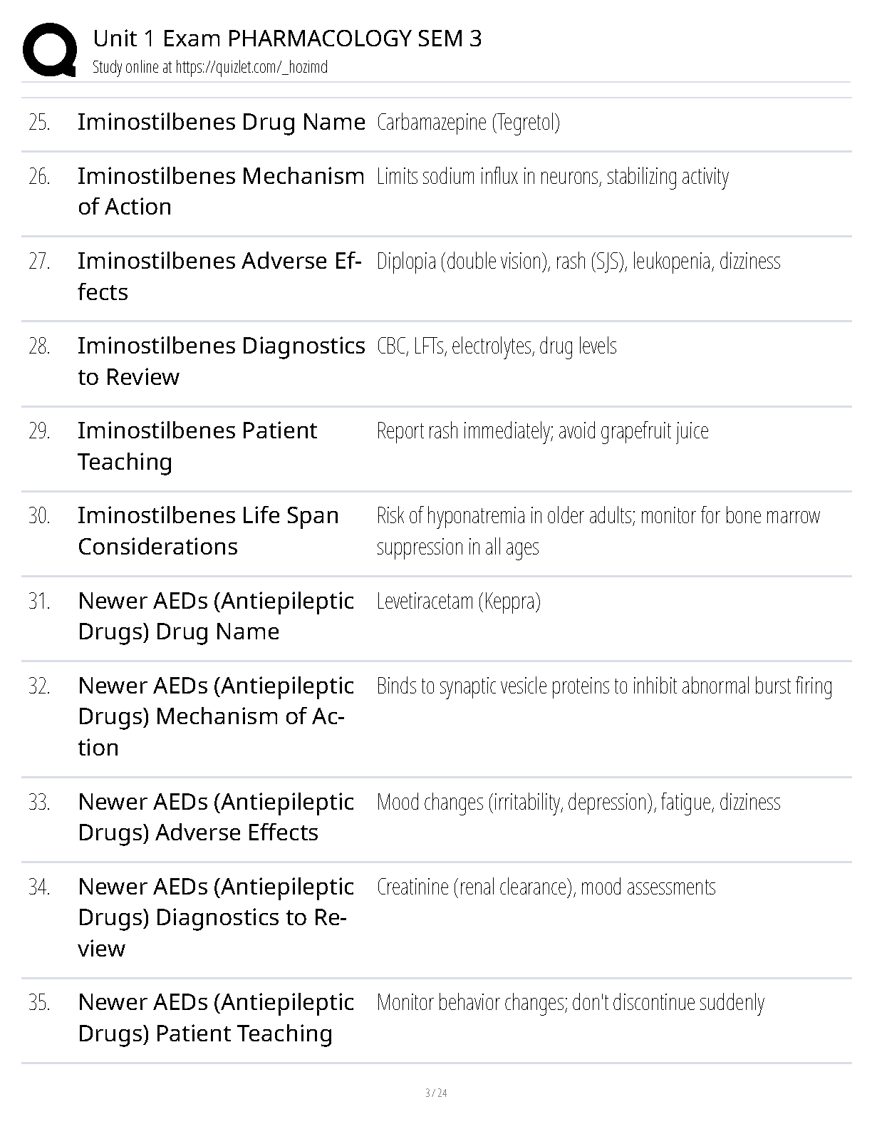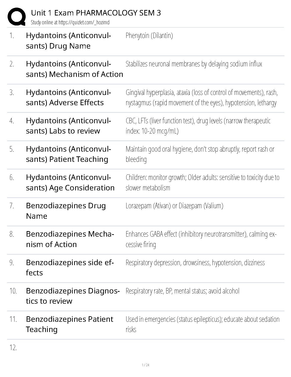 Struggling with Pharmacology? Unlock your potential with our expertly crafted study guide for the Unit 1 Exam in Semester 3, fully updated for the 2025/2026 academic year. This comprehensive resource is designed to help you master complex topics and pass your exams on the first try, eliminating the need for costly resits. Inside, you'll find detailed, easy-to-digest notes on crucial drug classes, including Hydantoins (Anticonvulsants) and Benzodiazepines. We cover everything from drug names (Phenytoin, Lorazepam), mechanisms of action, adverse effects, and essential patient teaching points to critical lab values and age-specific considerations. Prepare efficiently and confidently with this ultimate study companion.