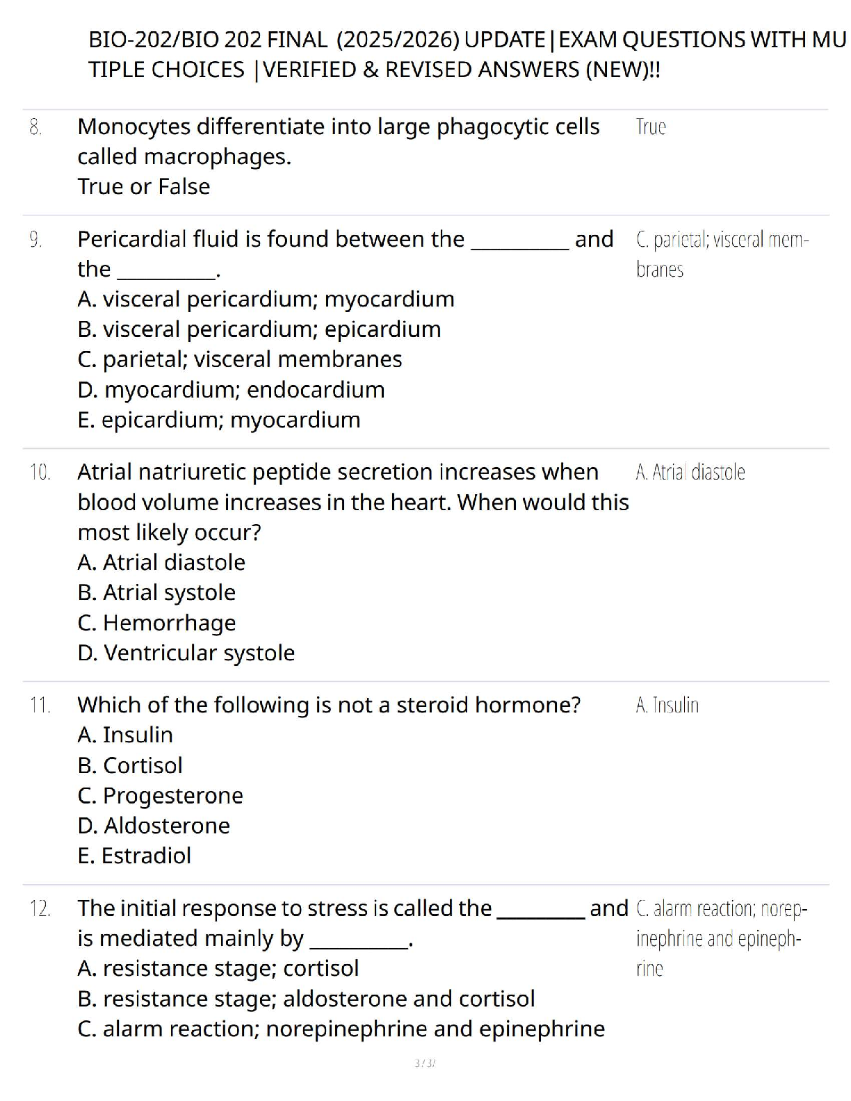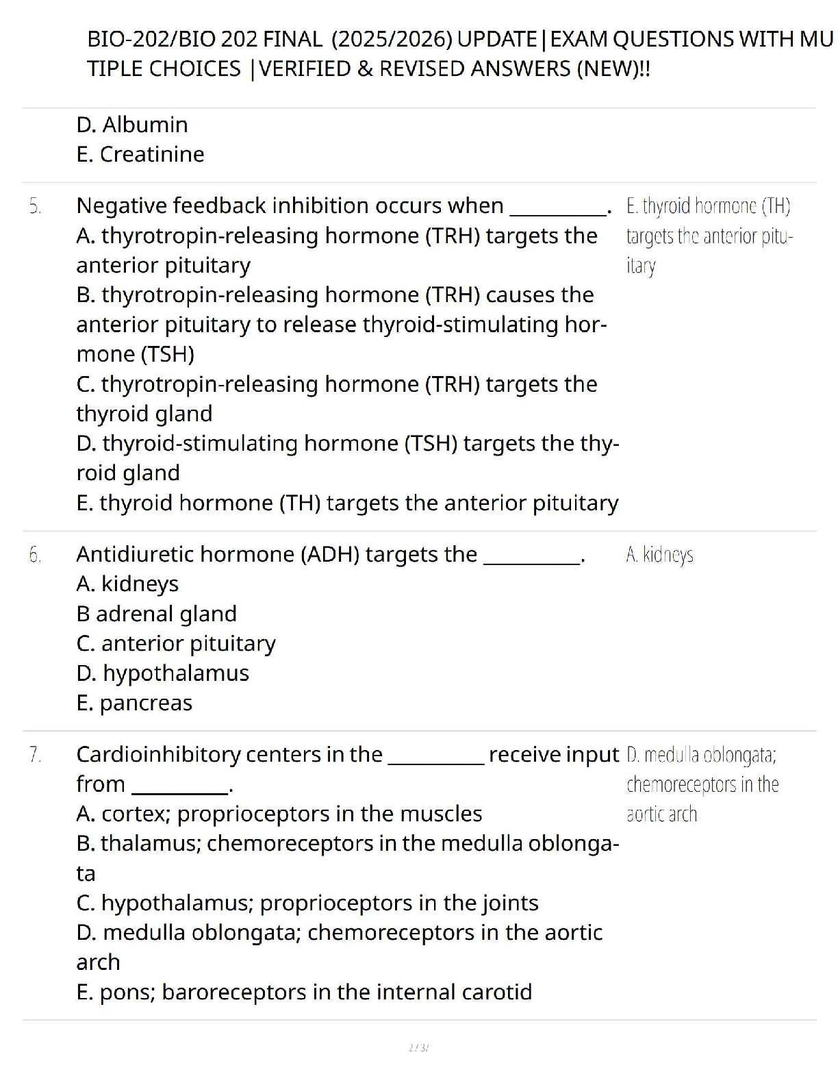 Ace your BIO-202 Anatomy and Physiology final exam with our latest 2025-2026 test bank! This comprehensive study resource is packed with hundreds of updated multiple-choice questions, complete with verified answers and detailed explanations. It covers all essential topics, from hormonal actions to cellular biology, mirroring the format and difficulty of the actual exam. Stop cramming and start studying smarter. This guide is expertly designed to help you master the material, boost your confidence, and pass your exam on the very first attempt, saving you from the stress of resits. Download now and secure your top grade!