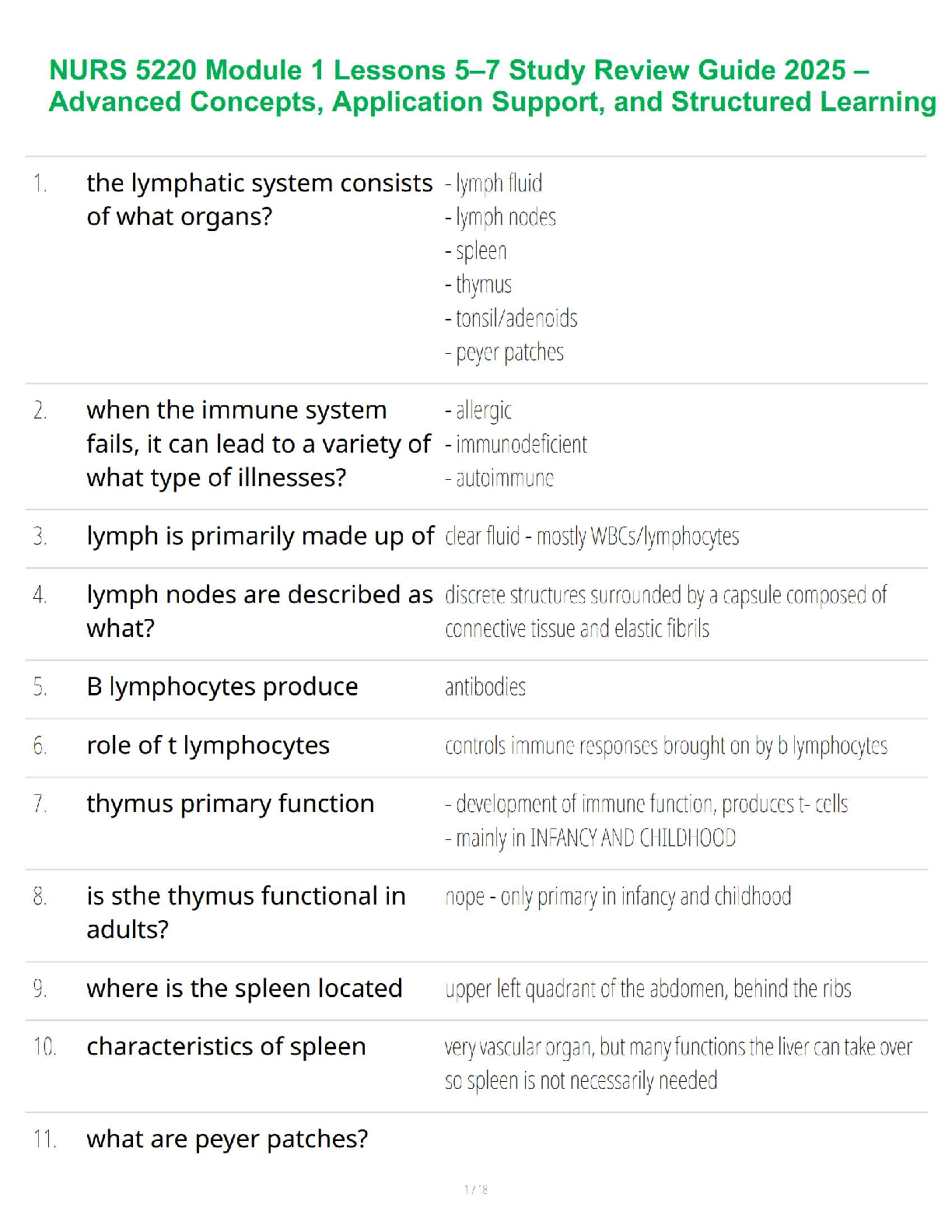 Unlock academic success in your NURS 5220 course with this meticulously crafted Study Review Guide for Module 1, Lessons 5-7. Updated for the 2025/2026 academic year, this guide provides structured learning support through a detailed question-and-answer format. It covers crucial advanced concepts related to the lymphatic and immune systems, including the functions of lymph nodes, spleen, thymus, and the roles of B and T lymphocytes. This resource is expertly designed to reinforce your understanding, support practical application, and ensure you are fully prepared to pass your exams without the need for resits.