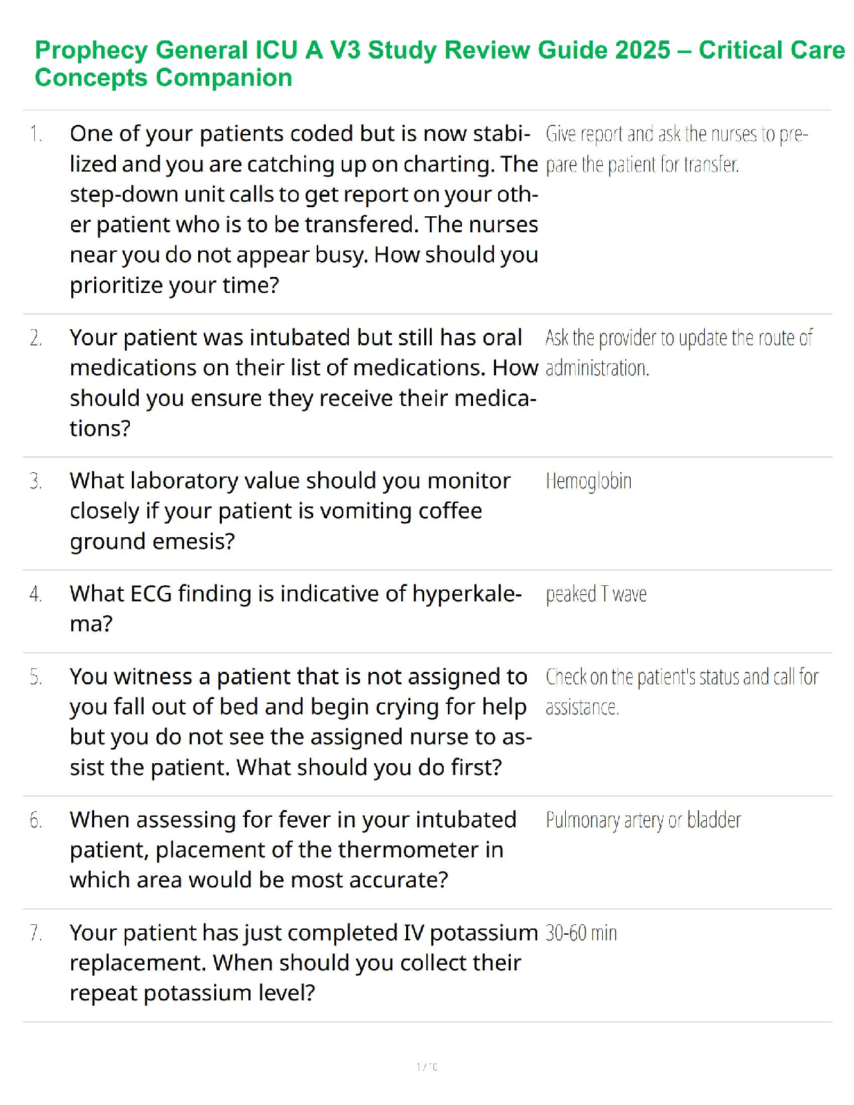 Master the Prophecy General ICU A V3 exam with our newly updated 2025-2026 Study Review Guide. This comprehensive companion is expertly designed to help you pass on your first try, eliminating the stress of resits. Inside, you'll find a detailed collection of practice questions and verified answers covering essential critical care concepts. Topics include patient prioritization, medication administration for intubated patients, ECG interpretation for conditions like hyperkalemia, key lab values, and immediate responses to patient safety events. Prepare effectively and confidently with this ultimate resource for acing your ICU certification.