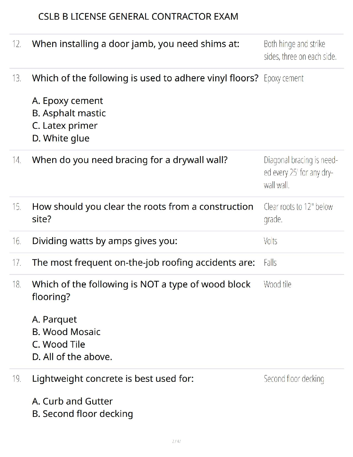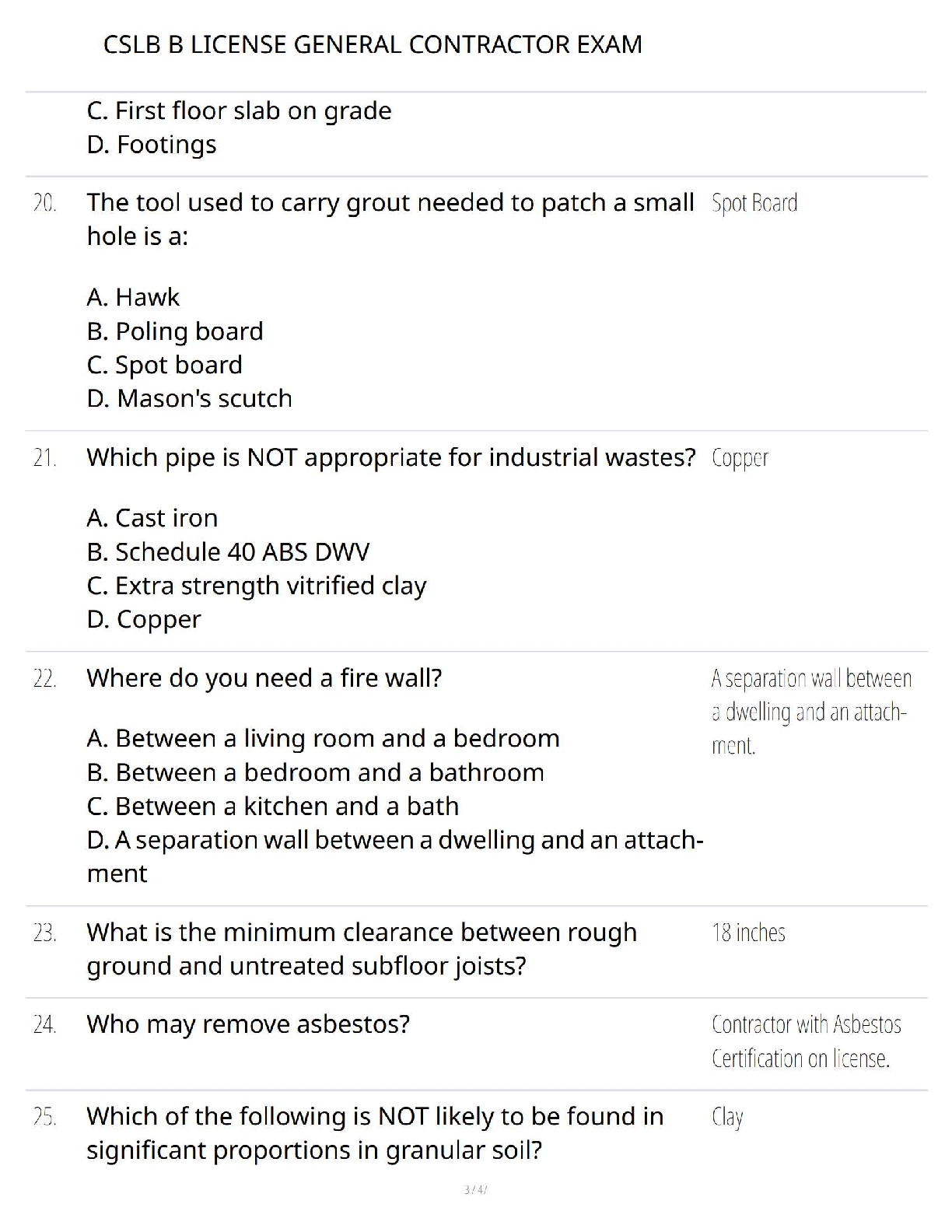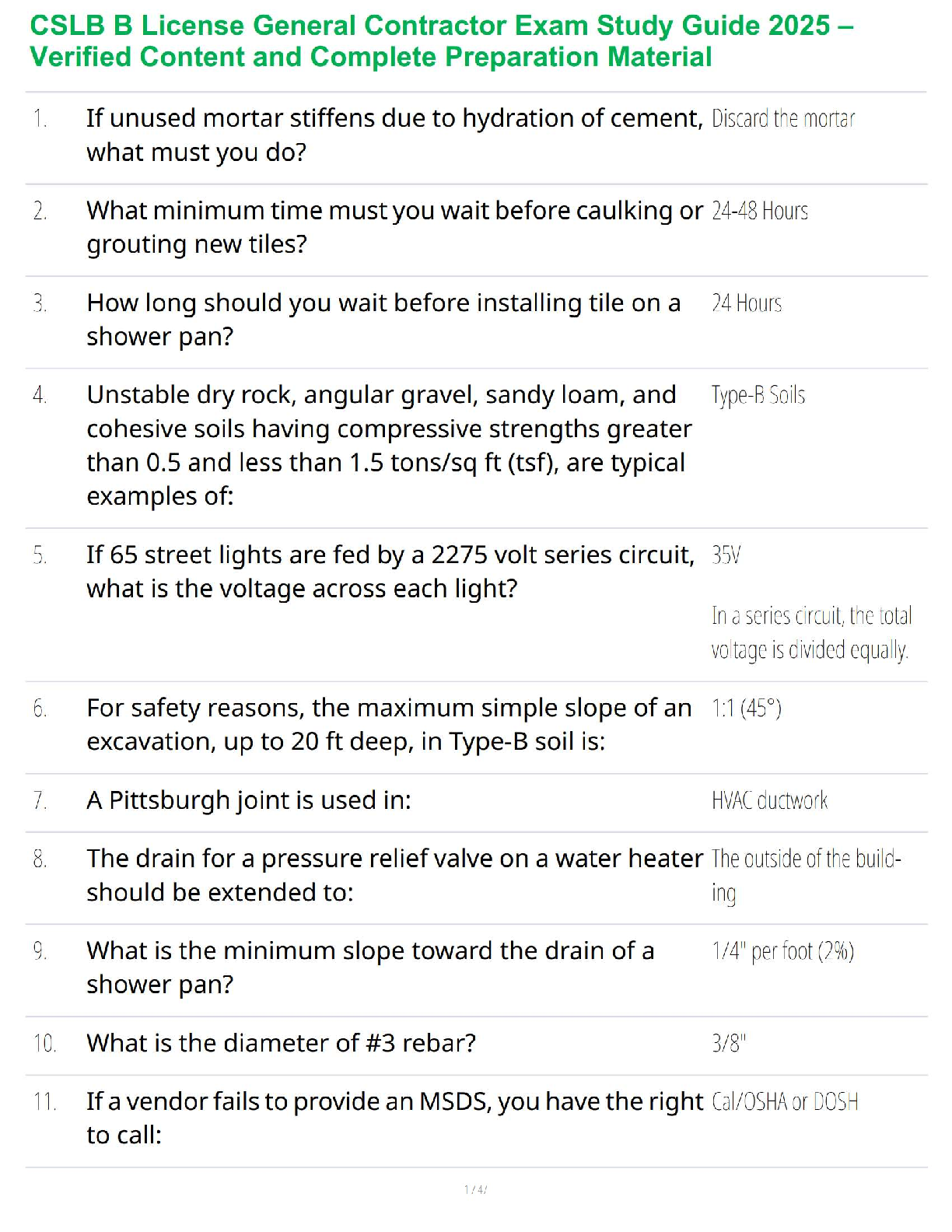 Ace your California General Contractor exam with our comprehensive test bank for the 2025-2026 CSLB B License exam. This complete study guide features a collection of verified questions and detailed answers covering all essential topics you'll face on the test, including safety protocols, materials like mortar and rebar, soil classification, electrical principles, plumbing, and excavation standards. Designed to provide you with the exact knowledge needed to succeed, this preparation material is your key to passing on the first attempt and avoiding costly resits. Get the confidence you need to become a licensed general contractor in California.