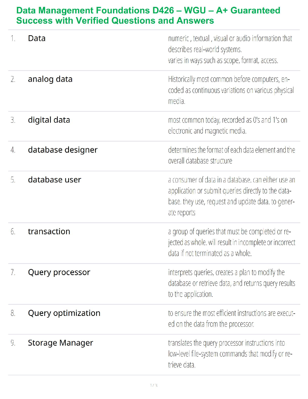 Ace your WGU D426 Data Management Foundations exam with our latest 2025/2026 study resource. This comprehensive guide is packed with verified questions and detailed answers covering all essential topics from the course curriculum. From fundamental concepts like analog vs. digital data to complex processes like query optimization and storage management, we've got you covered. Designed to help you master the material efficiently and pass your exam on the very first try, this is the ultimate tool to avoid resits and secure top grades. Download now for guaranteed success!