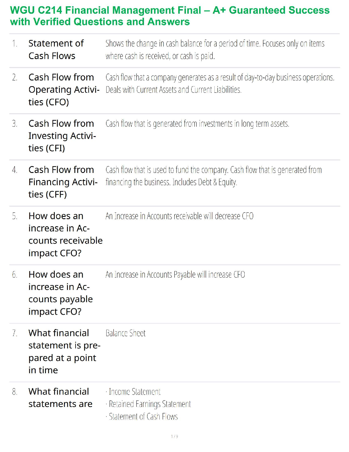 Unlock A+ success in your WGU C214 Financial Management final exam with our comprehensive study guide for the 2025/2026 academic year. This essential resource features a meticulously compiled set of verified questions and detailed, accurate answers, covering all critical topics such as the Statement of Cash Flows, Operating, Investing, and Financing Activities, and core financial statement principles. Designed to help you master the material efficiently and pass on your first attempt, this guide is your key to avoiding resits and acing your financial management course.