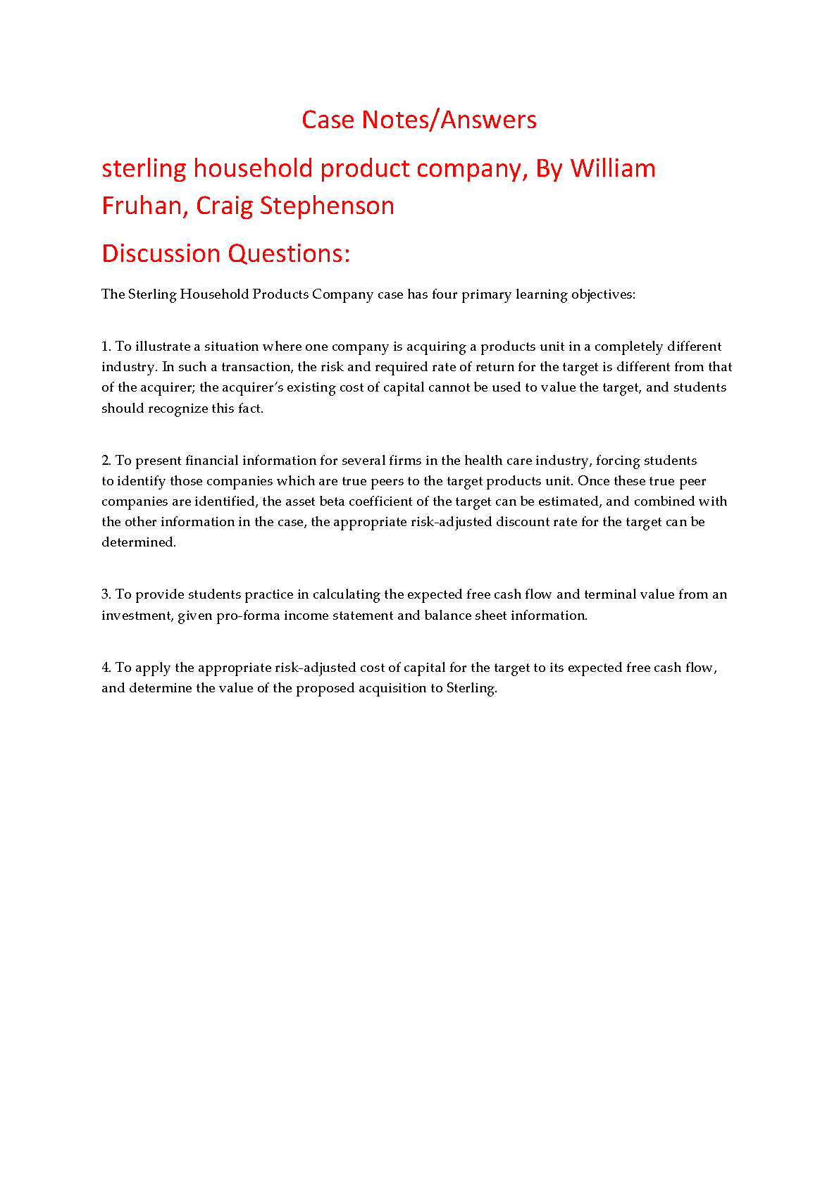 Unlock a comprehensive understanding of the 'Sterling Household Product Company' case study with our detailed solution manual and notes. Authored by William E. Fruhan Jr. and Craig Stephenson, this guide provides in-depth answers and analysis to master complex corporate finance concepts. Our resource walks you through key learning objectives, including valuing an acquisition in a new industry, calculating the risk-adjusted cost of capital using peer company data, and performing free cash flow (FCF) valuation. Perfect for students aiming to ace their finance courses, this guide simplifies pro-forma statements, asset beta calculation, and terminal value estimation. Get the complete answers you need to solve the Sterling case successfully.