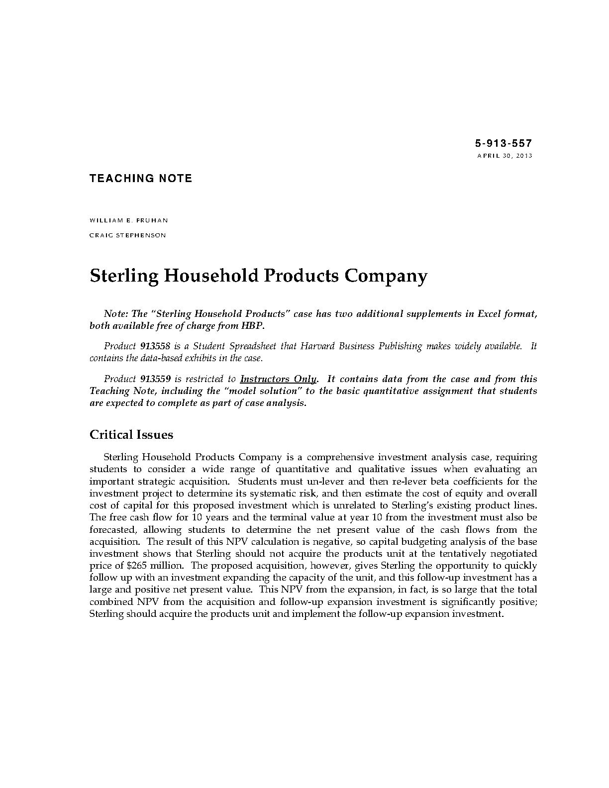 Sterling Household Product Company Case Study: Complete Solution & Notes by William E. Fruhan Jr., Craig Stephenson (2025/2026 Edition)