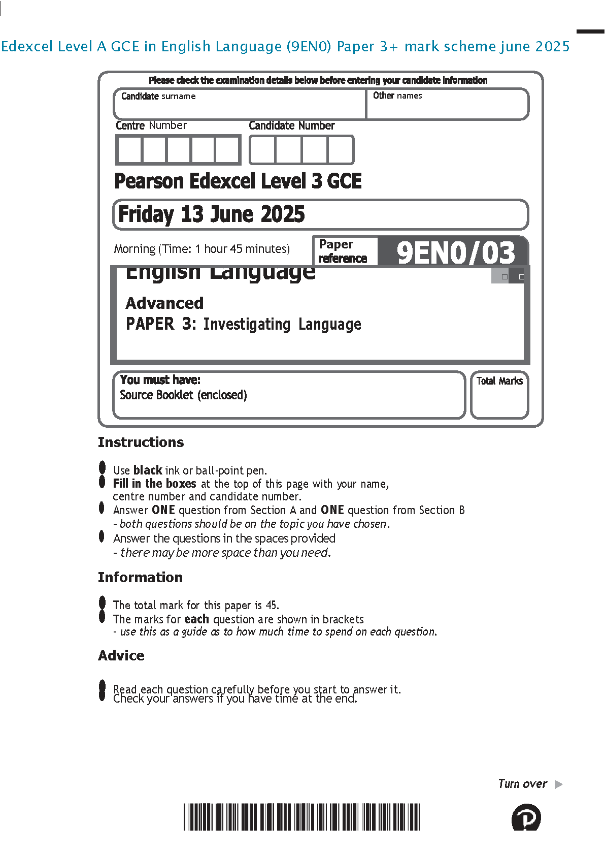Unlock top grades with the complete and official mark scheme for the Pearson Edexcel A Level English Language Paper 3 (9EN0/03), titled 'Investigating Language,' from the June 2025 exam session. This essential study aid provides in-depth solutions and a clear breakdown of the marking criteria. Use this resource to refine your answering technique, understand examiner expectations, and confidently prepare for your A Level English Language exam. Perfect for self-assessment and targeted revision.