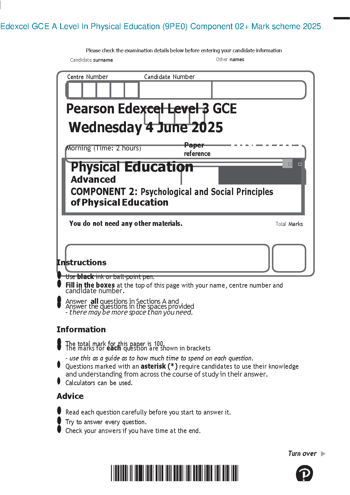 Get the ultimate study advantage with the official Pearson Edexcel A Level Physical Education (9PE0) Mark Scheme for the June 2025 exam. This essential resource provides complete, detailed answers for Component 2: Psychological and Social Principles of Physical Education. Use this guide to understand how examiners award marks, perfect your exam technique, and confidently prepare to achieve the highest possible grade on your first attempt. It's the perfect tool for targeted revision and acing your exams.
