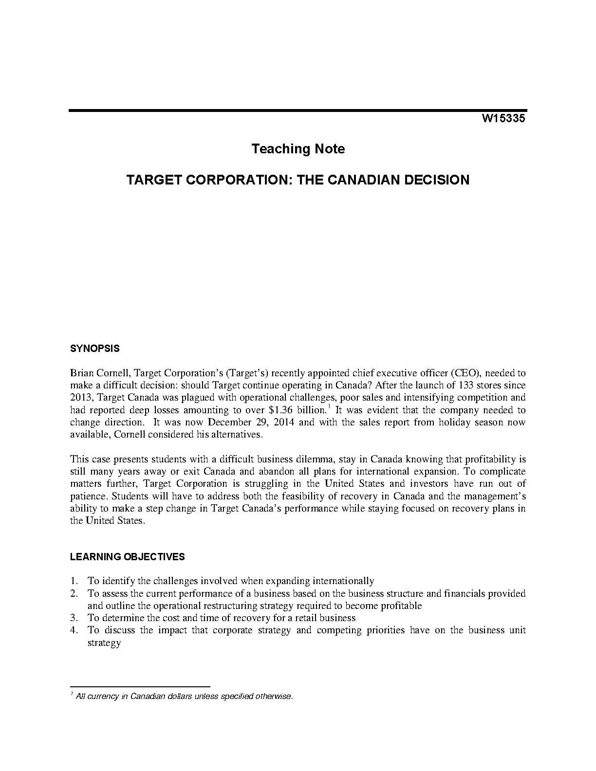 Target Corporation The Canadian Decision by David Wood & Tarika Menezes - Case Study Solution and Analysis