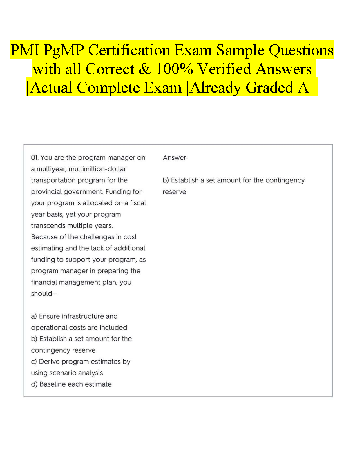 Get ready to ace your Program Management Professional (PgMP) certification exam with our comprehensive test bank. This resource is packed with actual exam questions, each accompanied by a 100% correct and verified answer. Sourced from the latest PMI standards, this A+ graded collection covers all essential domains, ensuring you're fully prepared to pass on your first attempt. Stop worrying about resits and start your journey to becoming a certified PgMP today with this ultimate study companion.