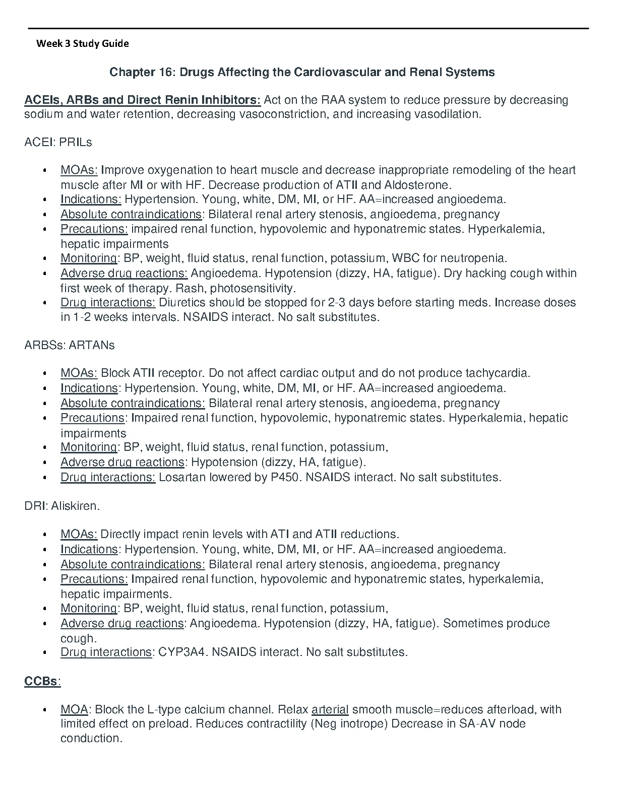NR 566 WEEK 3 STUDY GUIDE CHAPTER 16: DRUGS AFFECTING THE CARDIOVASCULAR AND RENAL SYSTEMS