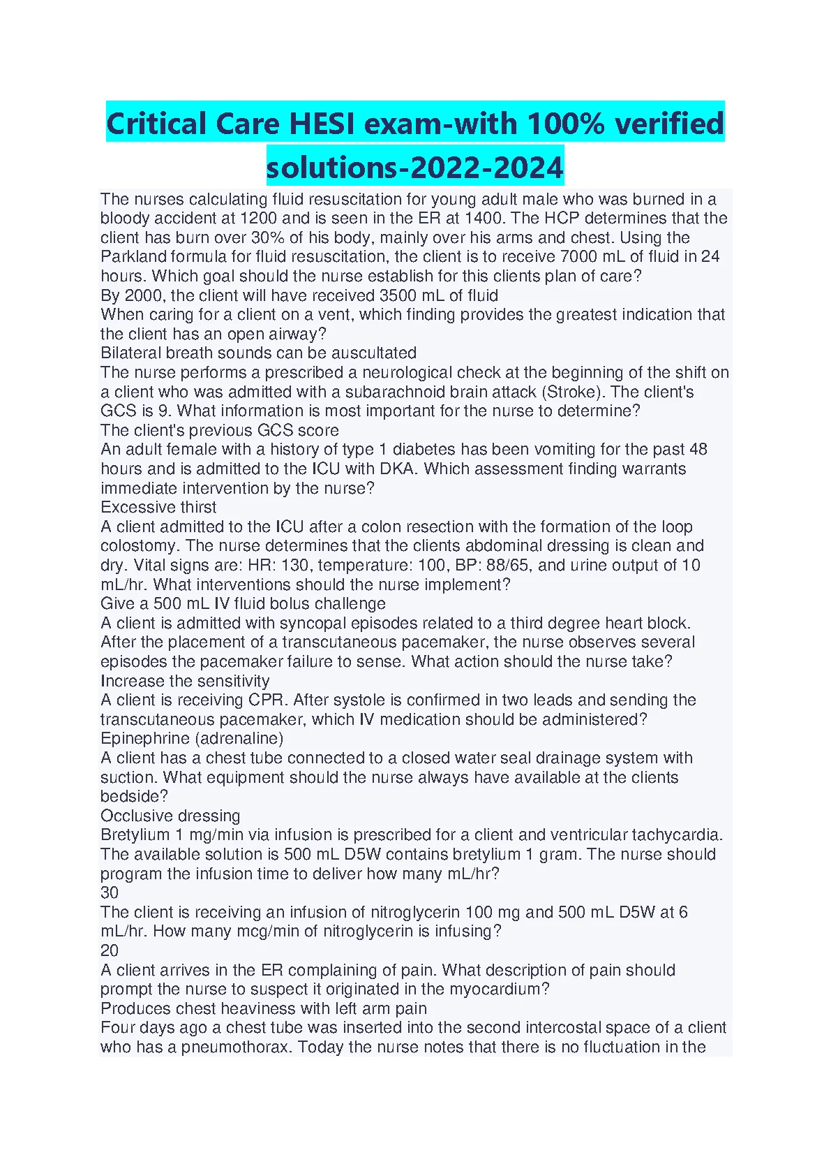 CRITICAL CARE HESI EXAMS. QUESTIONS AND ANSWERS 2023/2024