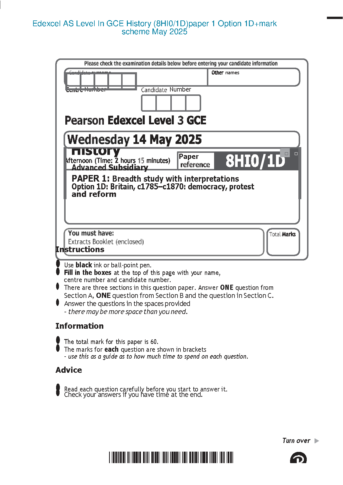 Get the ultimate advantage for your Edexcel AS Level History exams with this comprehensive resource for the 2025/2026 academic year. This package contains the official Pearson Edexcel GCE History Advanced Subsidiary Paper 1 (8HI0/1D) from May 2025, specifically covering Option 1D: Britain, c1785–c1870: democracy, protest and reform. Included is the complete question paper along with the official mark scheme, providing invaluable insight into examiner expectations. By working through this authentic past paper, you can perfect your exam technique, understand how to construct high-scoring answers, and build confidence to ace your exams on the first attempt. This is an essential study guide for any student aiming to achieve top grades and avoid costly resits.