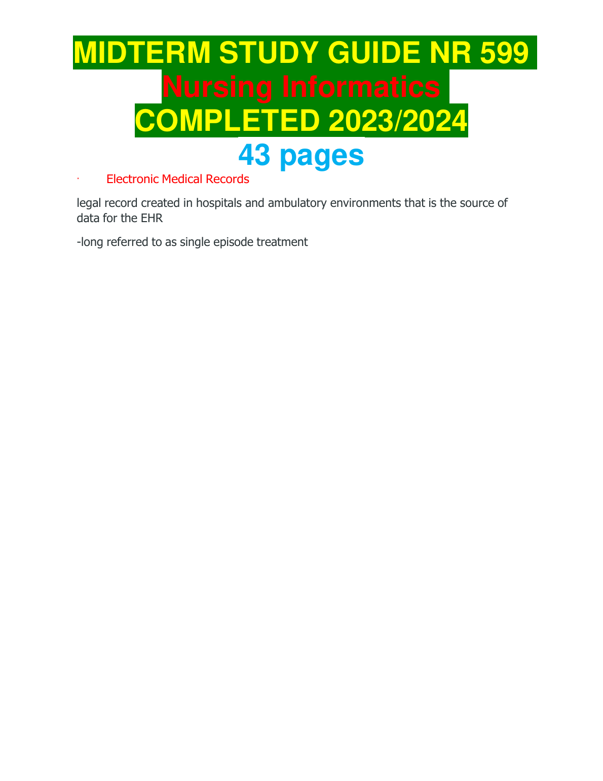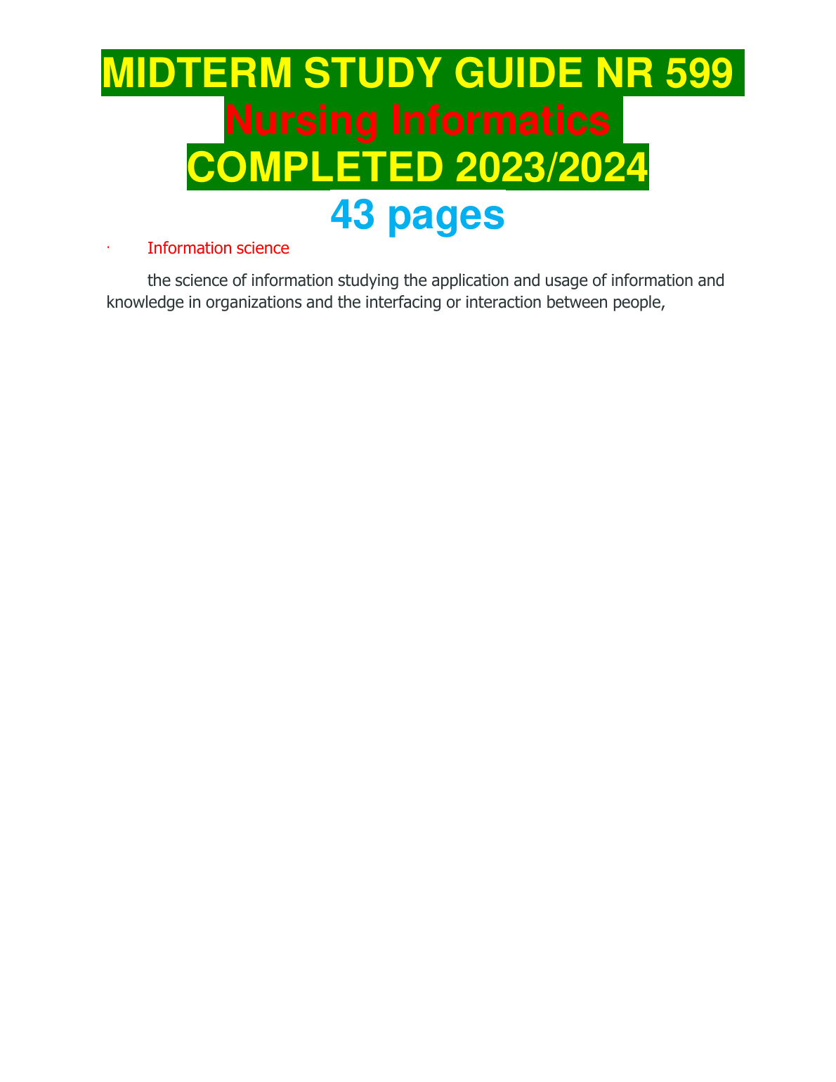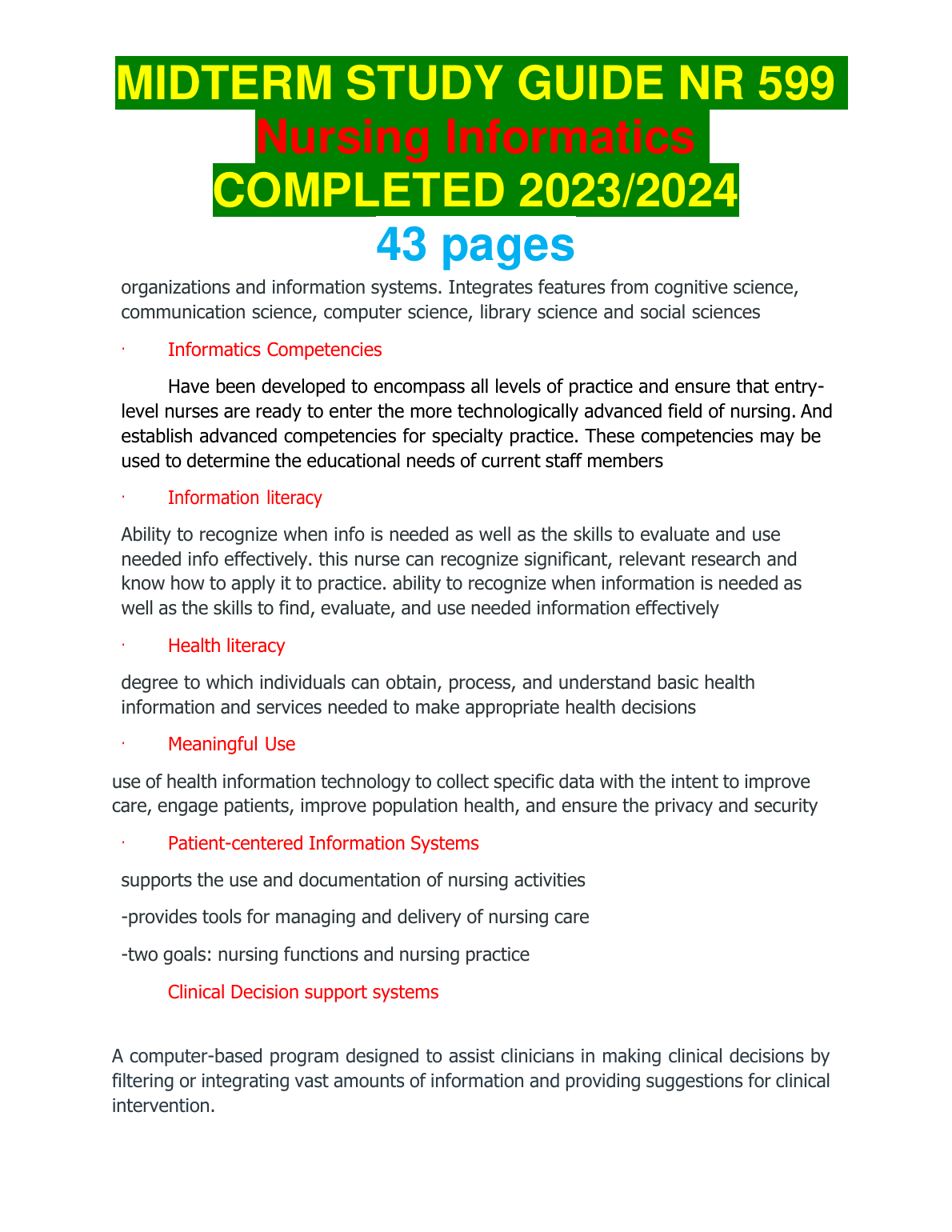 Midterm Study guide NR 599 Informatics. BRAND NEW 2023!!!
