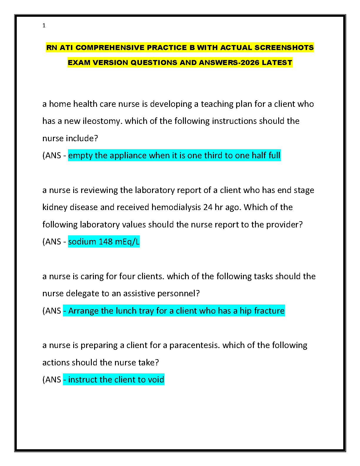 Ace your nursing exams with our latest 2025-2026 study guide for the RN ATI Comprehensive Practice B Exam. This comprehensive resource is packed with actual exam questions, screenshots, and expertly verified answers to ensure you are fully prepared. Designed to help you master critical concepts and pass on your first attempt, this guide is your key to avoiding resits and advancing in your nursing career. Get instant access and start studying smart today!