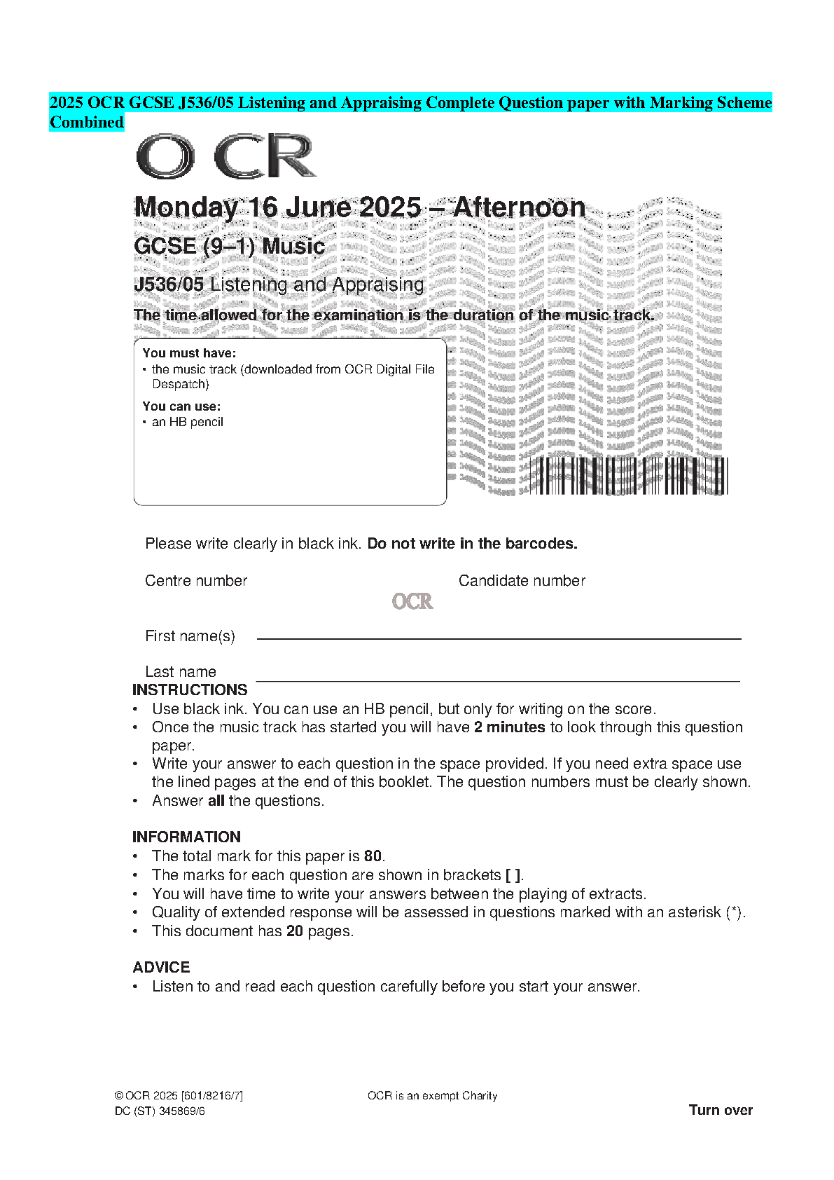 OCR GCSE Music (9-1) J536/05 Listening and Appraising 2025 Question Paper & Mark Scheme | Latest 2025/2026 Exam Prep to Ace Your Exams