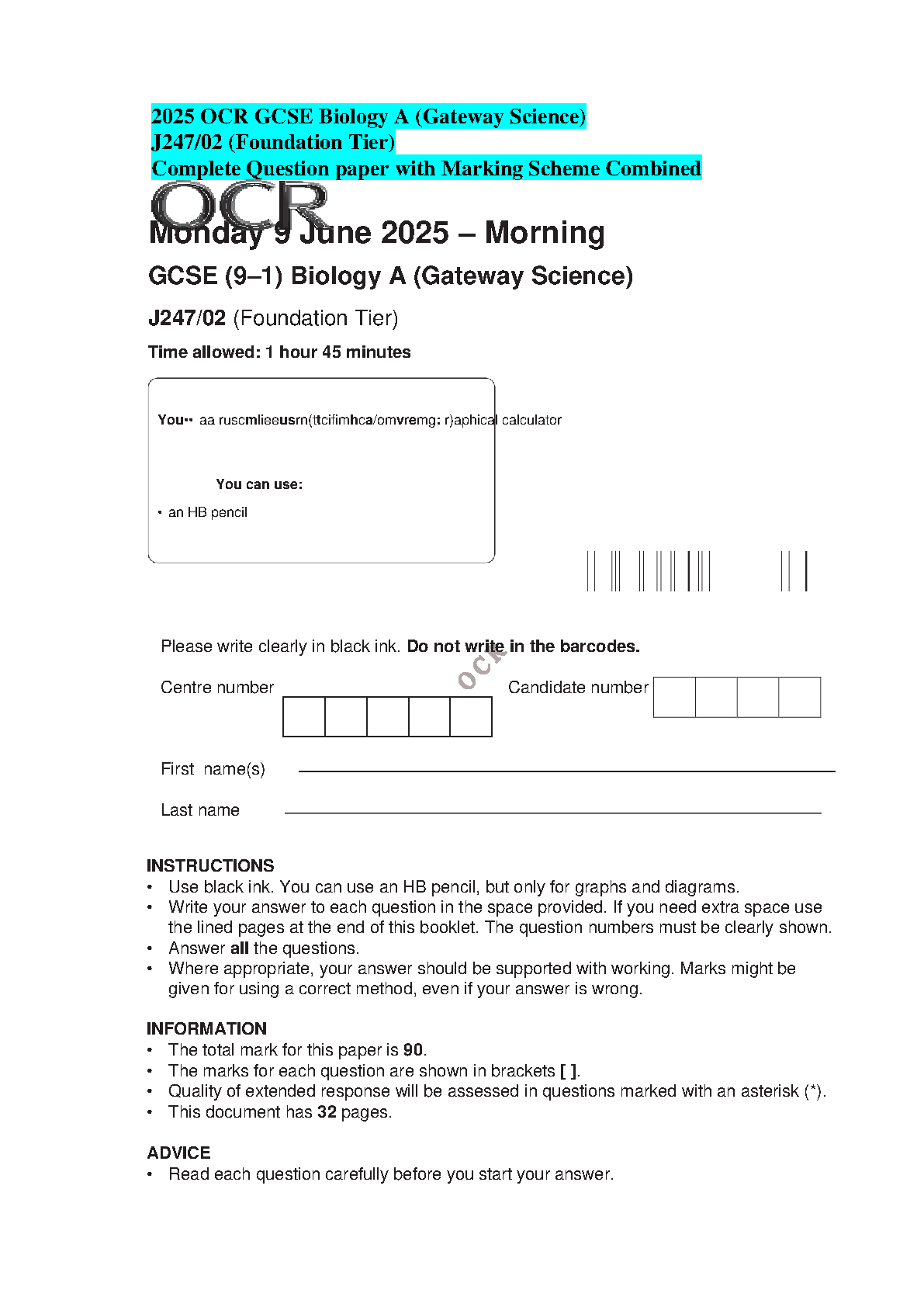 Latest 2025/2026 OCR GCSE Biology A (Gateway Science) J247/02 Foundation Tier Exam Paper & Mark Scheme - Your Key to Passing First Time!