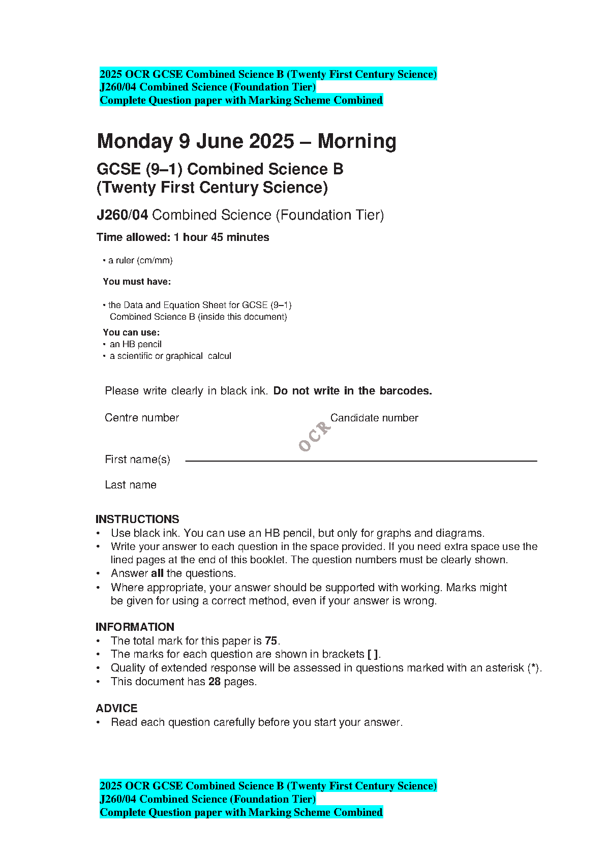 OCR GCSE Combined Science B (J260/04) 2025 Question Paper with Mark Scheme | Foundation Tier | Latest 2025/2026 Edition for First-Time Pass
