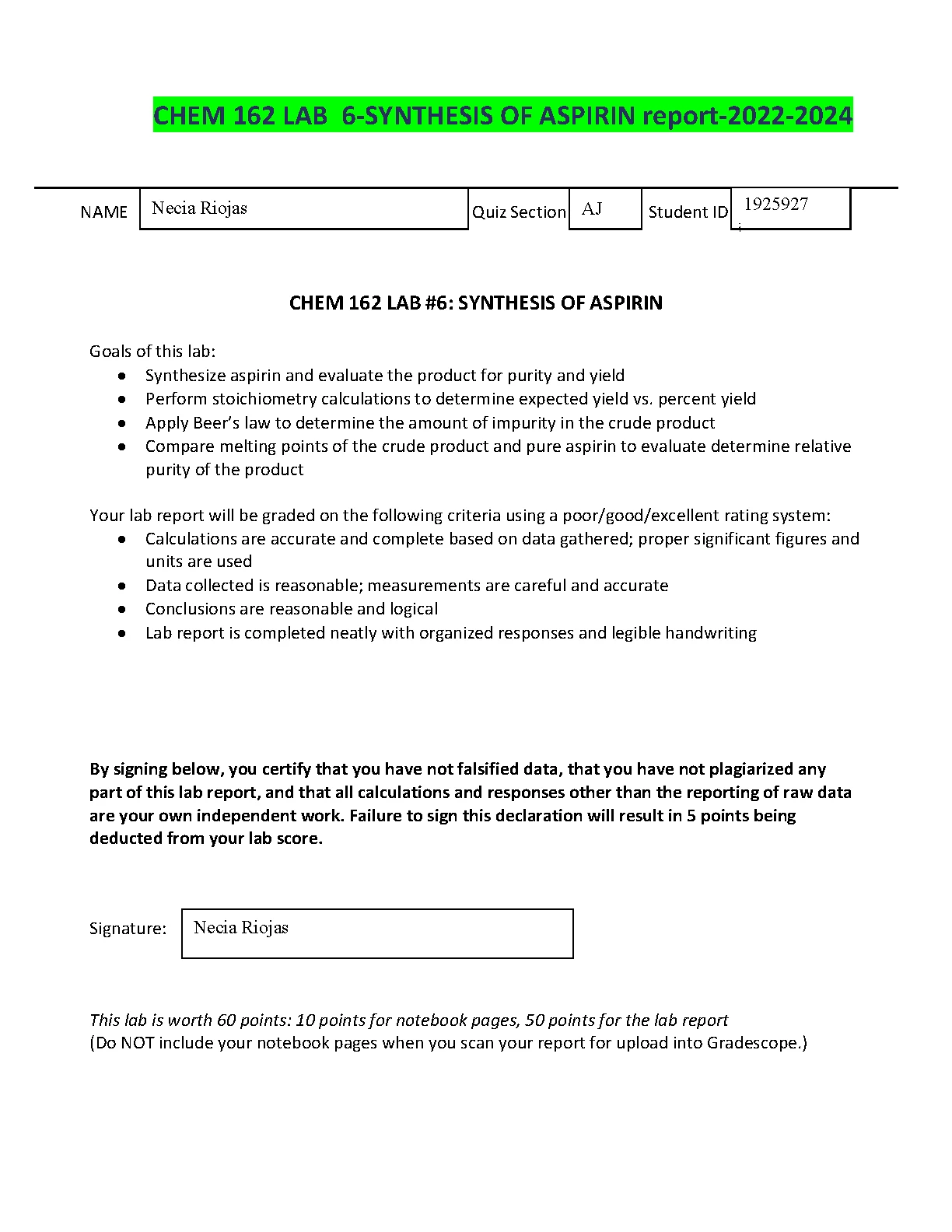 CHEM 162 LAB #6: SYNTHESIS OF ASPIRIN. BRAND NEW 2023/2024. DOWNLOAD on www.hackedexams.com INSTANTLY.