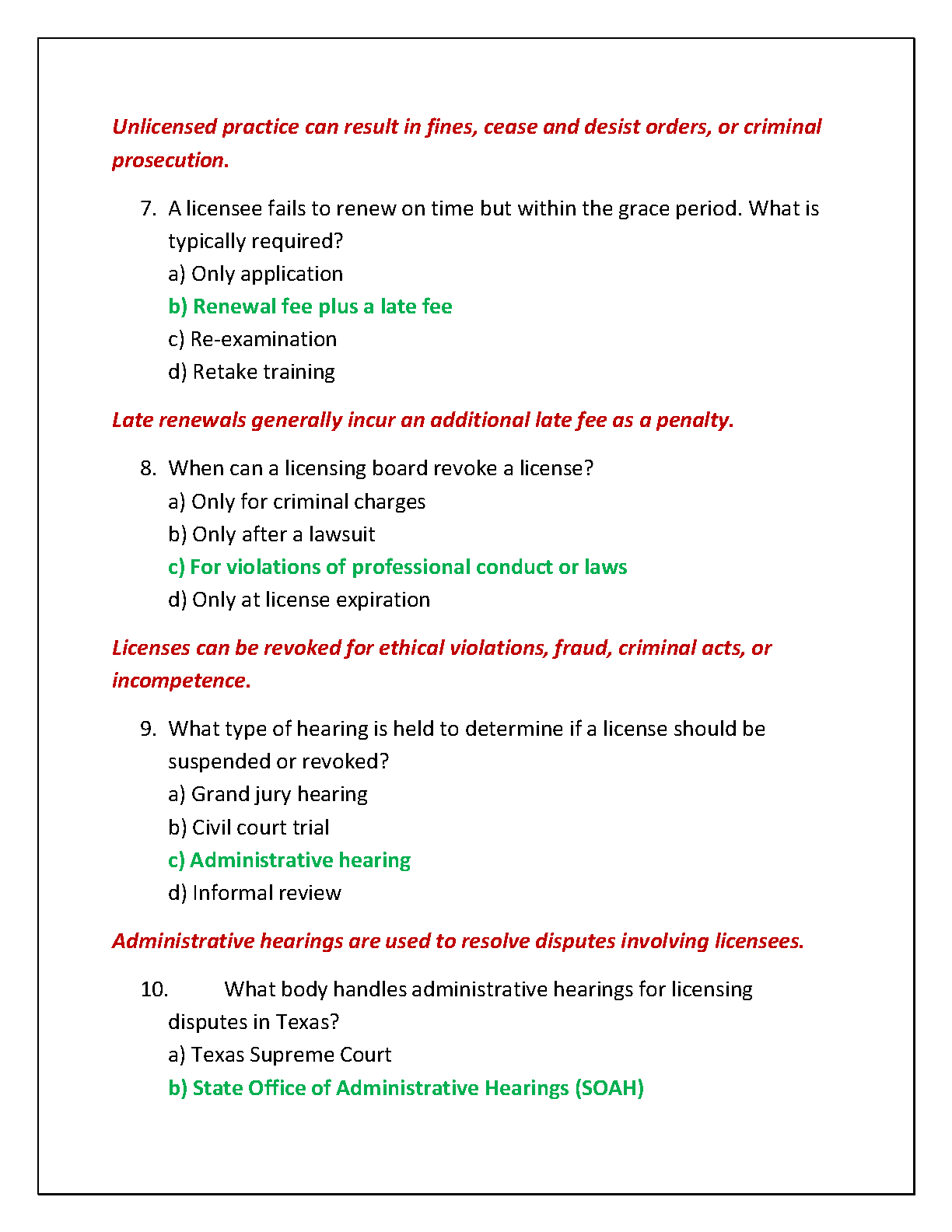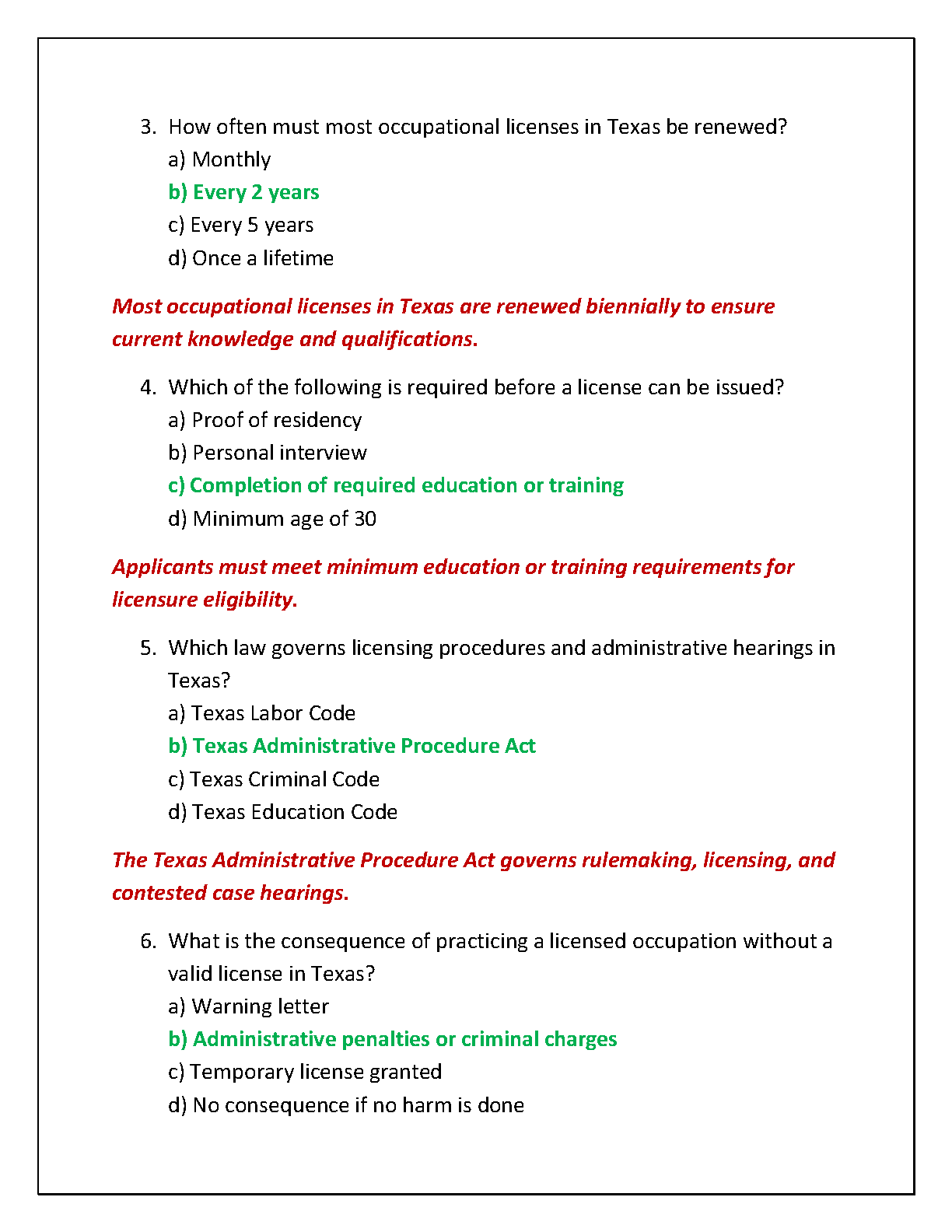 Ready to become a certified Texas Occupational Licensing Manager without the stress of retakes? This comprehensive study guide, updated for the 2025-2026 exam cycle, is your ultimate tool for success. It features a meticulously curated collection of practice questions that closely mirror the actual test format and content. Each question is paired with a verified correct answer and a detailed, easy-to-understand rationale, ensuring you not only learn the material but truly understand the 'why' behind it. Master the key concepts of Texas occupational licensing and regulation, boost your confidence, and pass your exam on the first attempt with this essential resource.