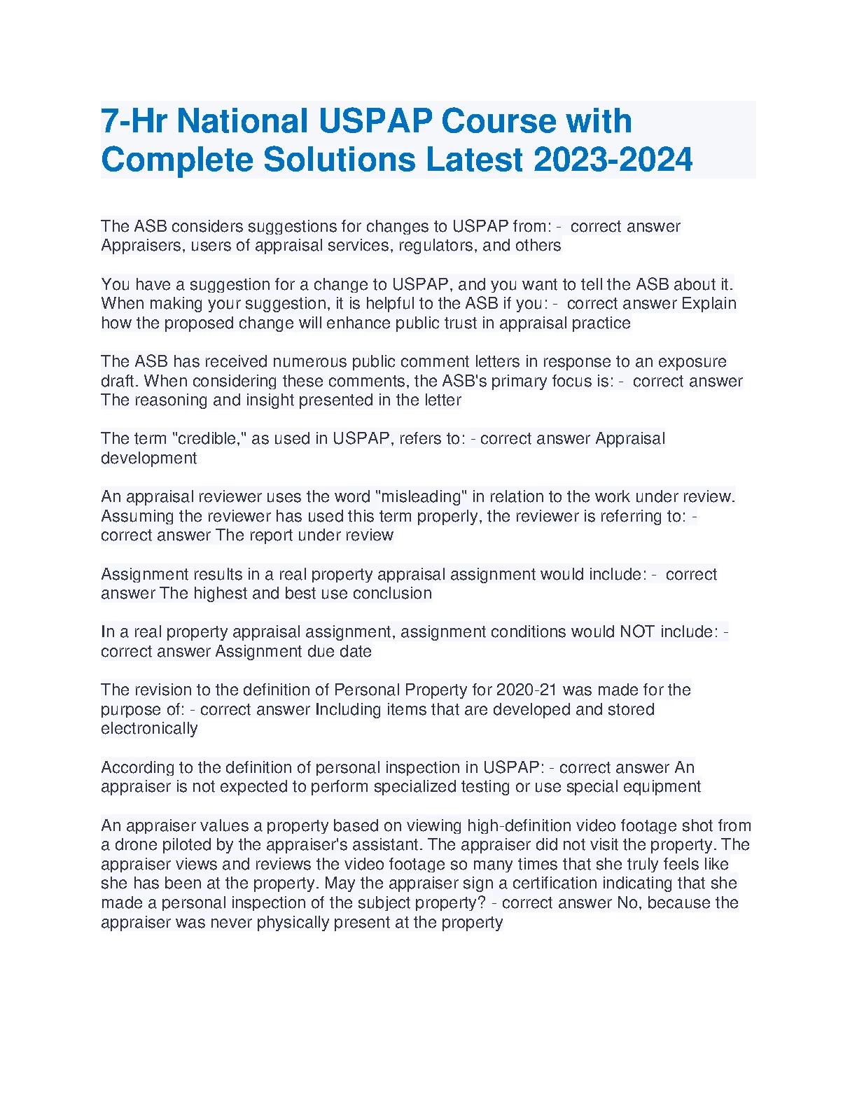 7-Hr National USPAP Course with Complete Solutions 2023/2024. GRADED A+. DOWNLOAD on www.hackedexams.com INSTANTLY.