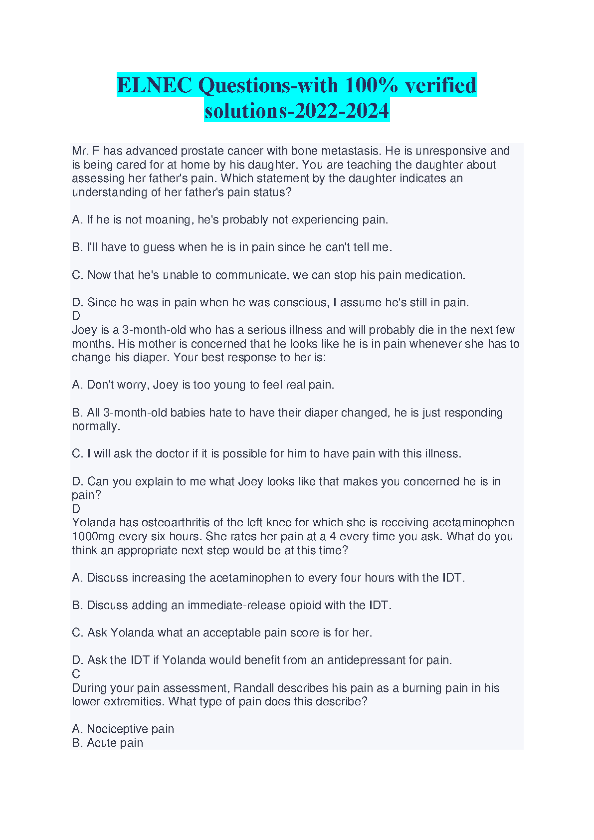 ELNEC Questions with 100% Verified Solutions 2023 RATED A+