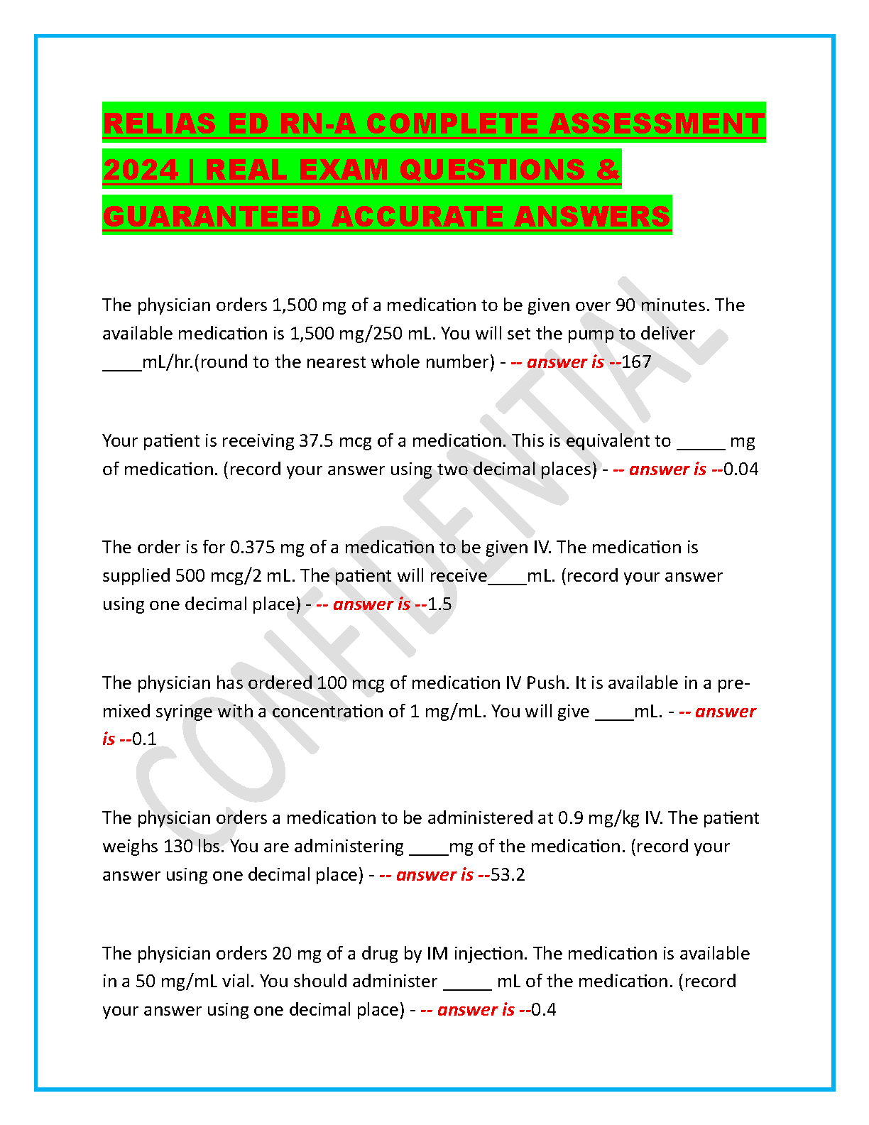 Ace your Relias ED RN-A assessment with our latest 2025/2026 test bank! This comprehensive study guide is packed with real exam questions and 100% accurate, verified answers. It specifically covers crucial topics like dosage calculations, IV drip rates, medication conversions, and other essential pharmacology math problems you'll encounter. Designed to mirror the actual exam format, this resource is your key to mastering the material, building confidence, and passing on your very first attempt. Avoid the stress of resits by preparing with the most up-to-date and reliable study material available.