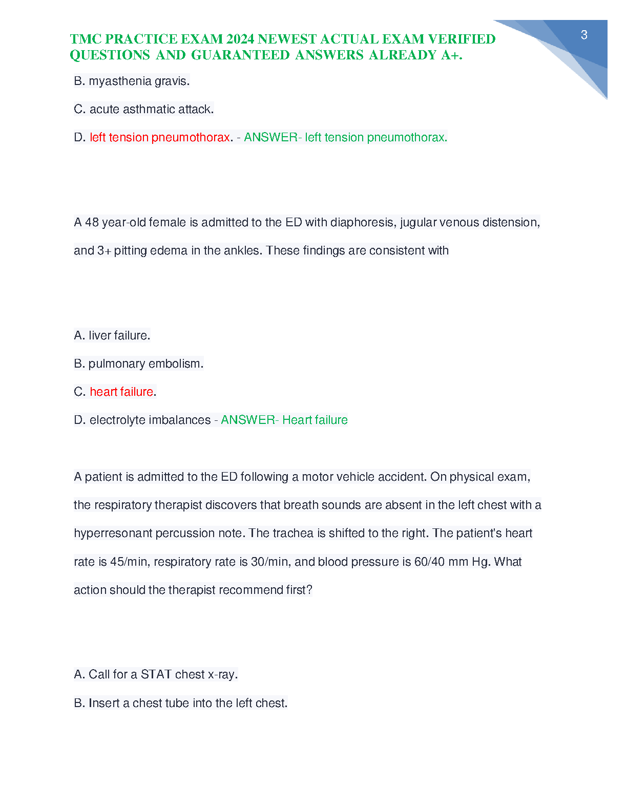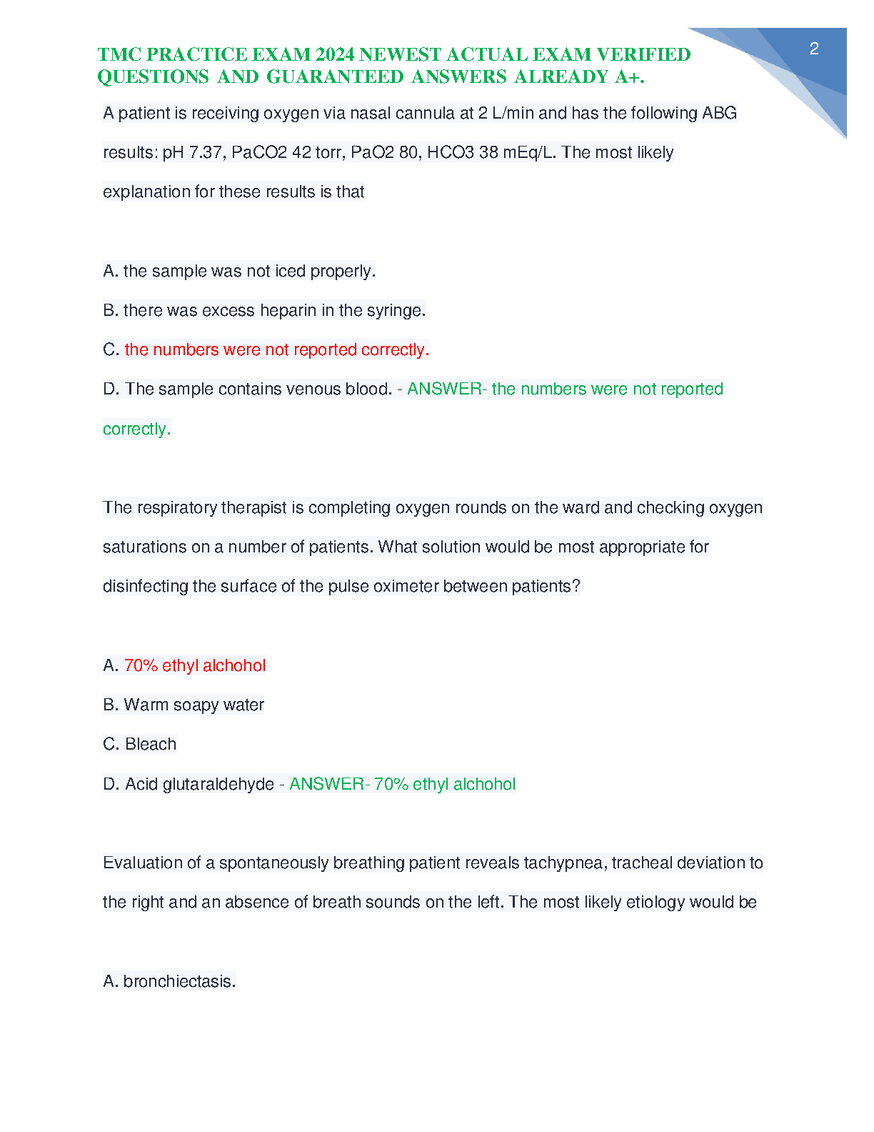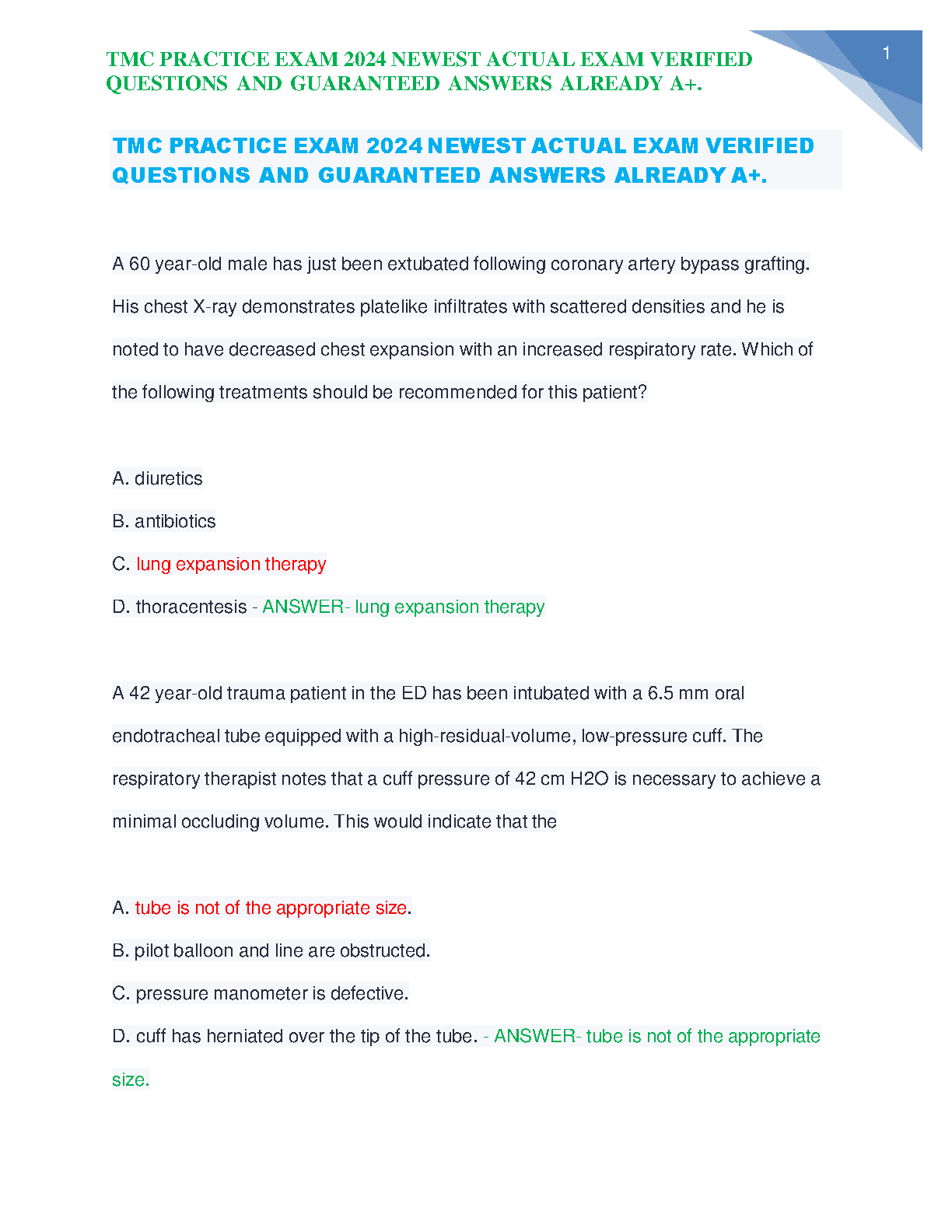 Prepare to excel in your NBRC Therapist Multiple-Choice (TMC) exam with our comprehensive 2024 test bank. This essential study guide features a collection of the newest, actual exam questions, each accompanied by a verified, A+ grade answer. Dive into realistic clinical scenarios covering key respiratory care topics, designed to mirror the real exam format. By practicing with these materials, you'll build the confidence and knowledge needed to pass the TMC exam on your first attempt and take the next step in your respiratory therapy career. Stop stressing and start studying smart with our guaranteed resource.