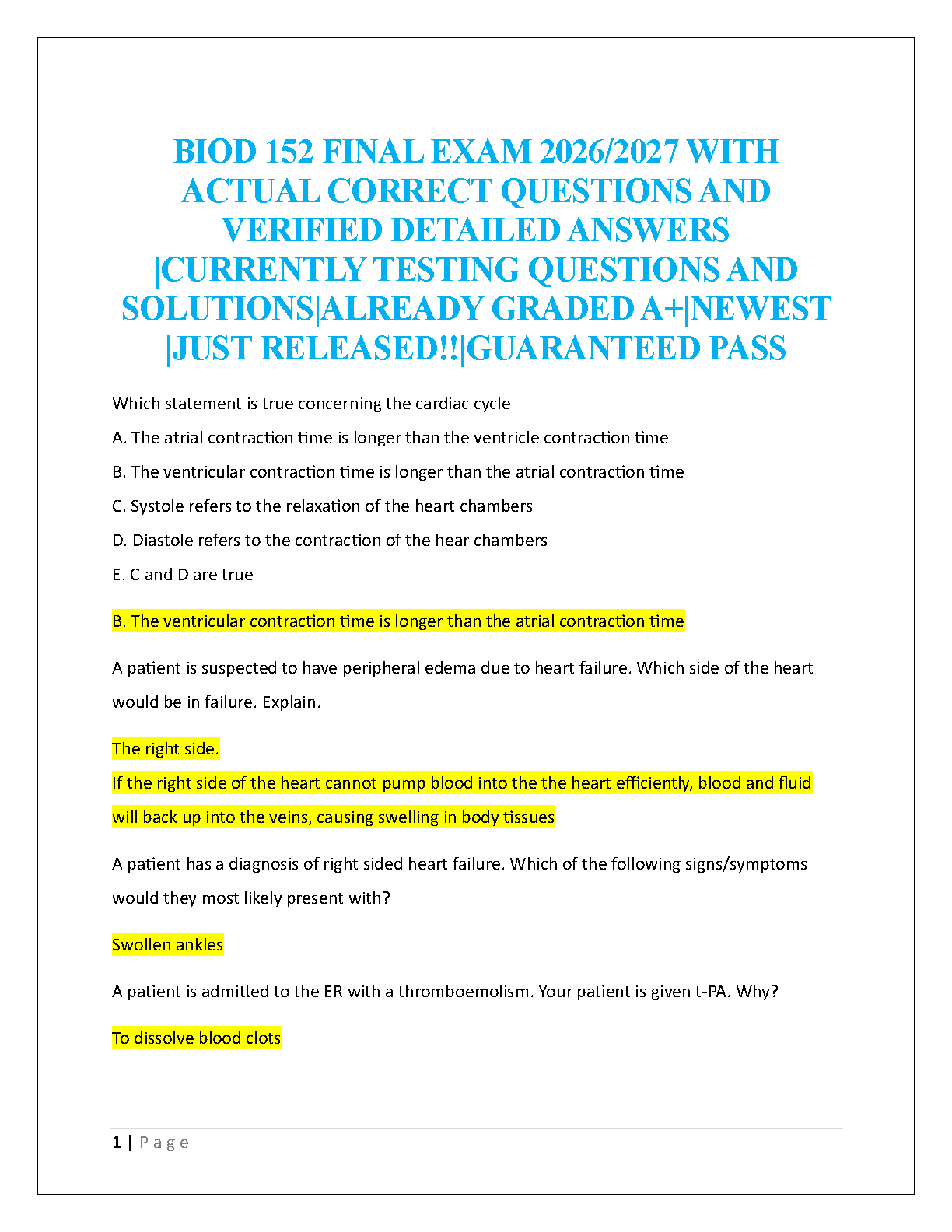 Struggling with Anatomy and Physiology II? Ace your BIOD 152 final exam with our newly released 2025/2026 study guide. This comprehensive resource is meticulously compiled with actual, currently tested exam questions and provides detailed, verified answers to ensure you grasp every concept. Covering crucial topics like the cardiac cycle and heart conditions, our guide is designed to help you study smarter, not harder. Achieve that A+ grade you've been working for and pass your final exam on the very first attempt. Avoid the stress of resits and walk into your exam with confidence. Get your guaranteed pass today!