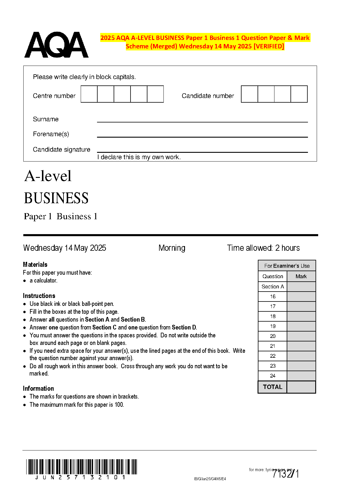 Achieve top grades in your A-Level Business exams with this essential resource for the 2025/2026 academic year. This is the verified, merged AQA A-Level Business Paper 1 (7132/1) from the May 14, 2025 exam session, complete with the official question paper and a detailed mark scheme. Perfect for students aiming to excel, this study pack allows you to practice with real exam questions, understand the marking criteria, and master the techniques needed to answer effectively. Prepare thoroughly, boost your confidence, and secure the grade you deserve on your first attempt, avoiding costly resits.