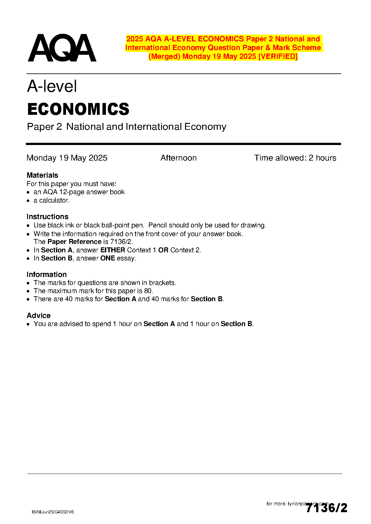 AQA A-Level Economics Paper 2 (7136/2) 2025 Question Paper and Mark Scheme | National and International Economy | Pass Your Exam First Try
