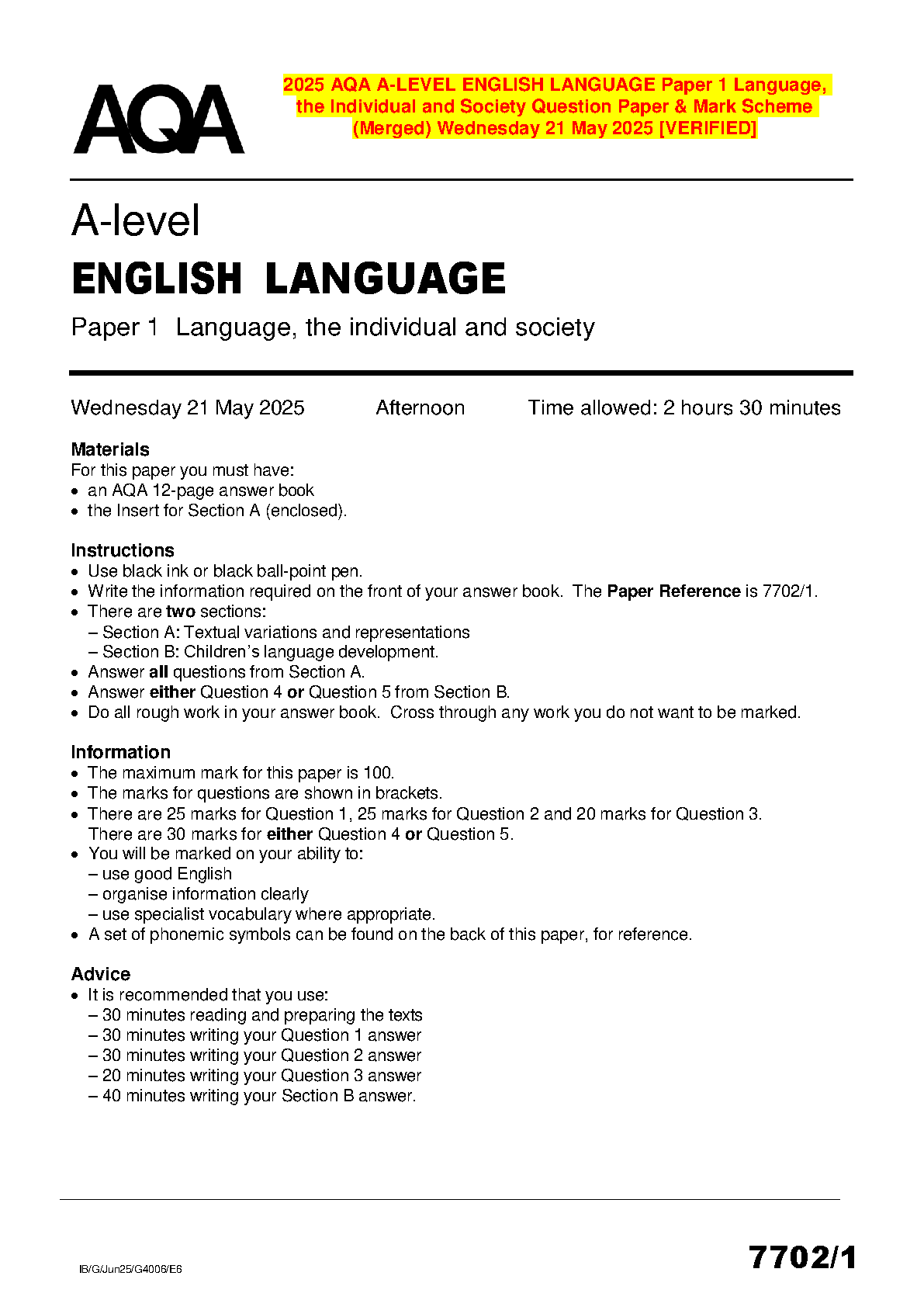 Verified 2025 AQA A-Level English Language Paper 1 Question Paper & Mark Scheme | Language, the Individual and Society (7702/1) | Pass Your Exam First Try
