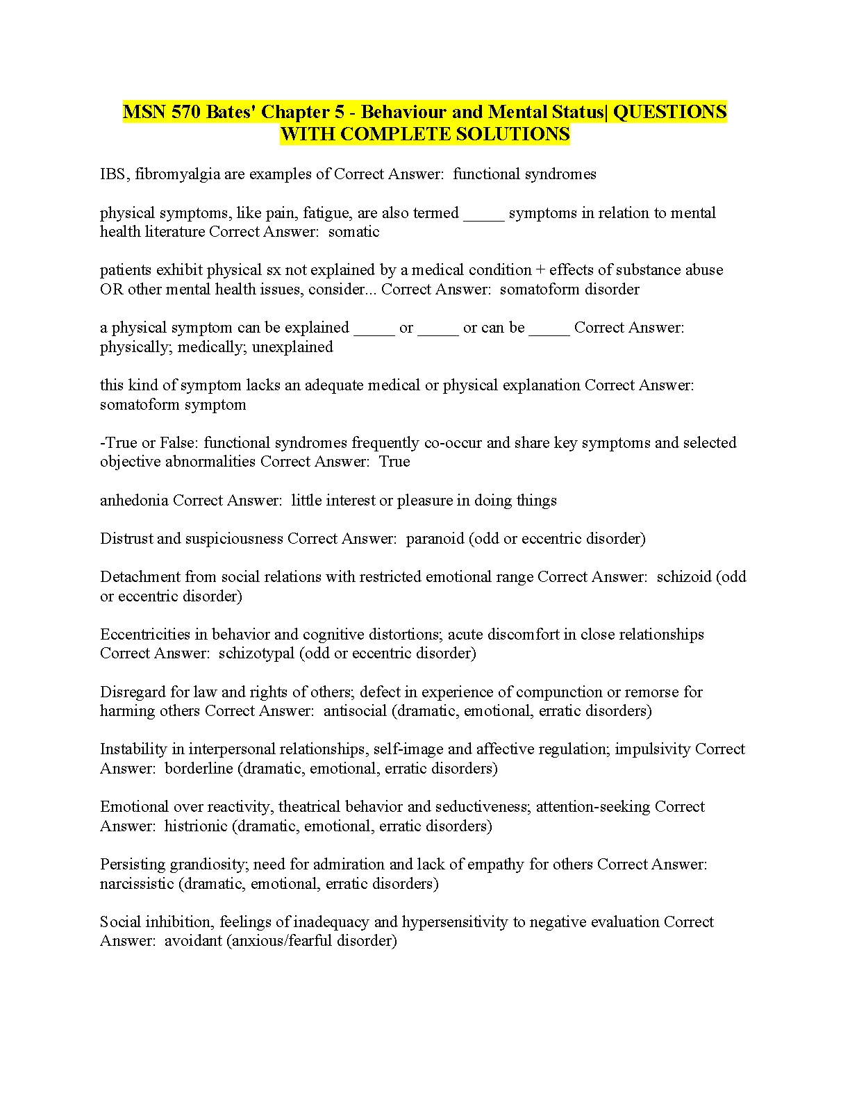 MSN 570 Bates' Chapter 5. Behaviour and Mental Status| QUESTIONS WITH COMPLETE SOLUTIONS 2023/2024. DOWNLOAD on www.Hackedexams.com INSTANTLY.