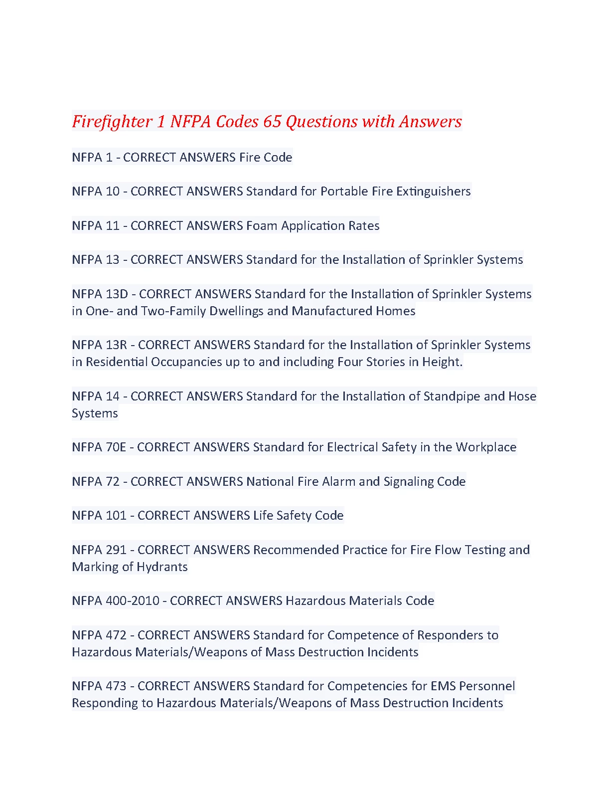 Firefighter 1 NFPA Codes 65 Questions with Answers. GRADED A+. DOWNLOAD on www.Hackedexams.com INSTANTLY.