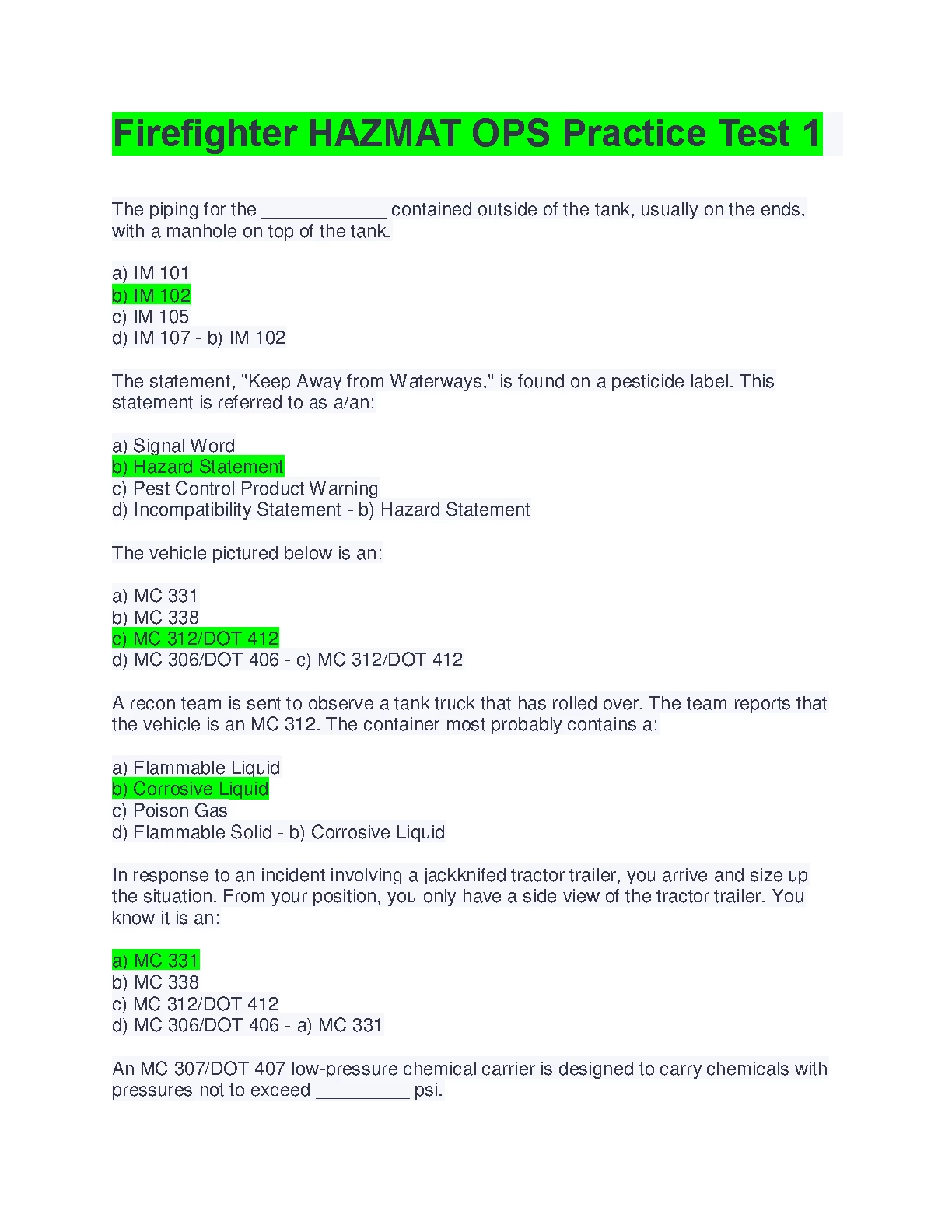 Firefighter HAZMAT OPS Practice Test 1. QUESTIONS WITH 100% VERIFIED ANSWERS