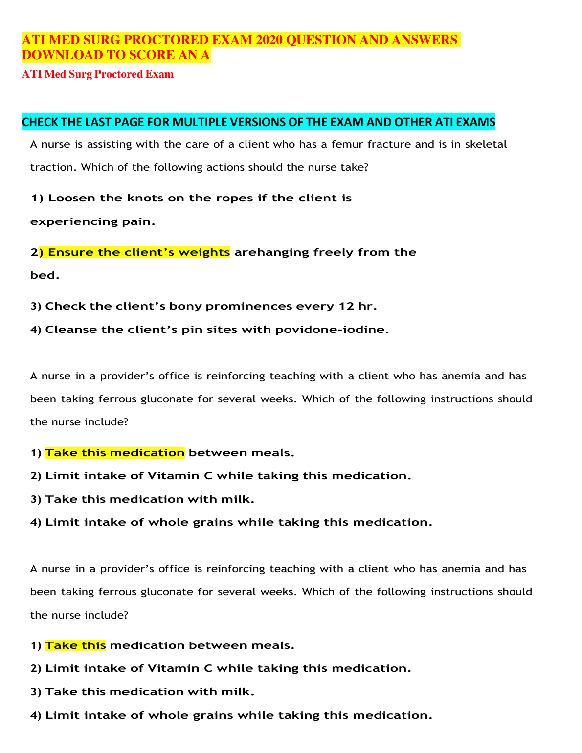 ATI RN MED SURG PROCTORED EXAM 2023 QUESTIONS WITH CORRECT AND VERIFIED ANSWERS ALREADY GRADED A . ATI MED SURG PROCTORED EXAM 2019 RETAKE WITH NGN (WITH CORRECT QUESTIONS AND ANSWERS GRADED A )UPDATED 2023 BRAND NEW WITH RATIONALES QBank ATI Med Surg Proctored Exam | Practice Questions and Answers (Graded A, Latest Update 2021) ATI MED SURG PROCTORED EXAM 2019 RETAKE WITH NGN Questions and Answers (Verified Answers) GRADED A UPDATED 2023 ATI MED SURG PROCTORED EXAM 2019 RETAKE WITH NGN Questions and Answers (Verified Answers) GRADED A ATI MISC MED SURG PROCTORED 2023 EXAM QUESTIONS AND HIGHLIGHTED ANSWERS GRADED 1. The nurse is providing a complete bed bath to a patient using a commercial bath cleansing pack (bag bath). What should the nurse do? a. Rinse thoroughly. b. Allow the skin to air-dry. c. Do not use a bath towel. d. Dry the skin with a towel. ANS: B The nurse should allow the skin to air-dry for 30 seconds. Drying the skin with a towel removes the emollient that is left behind after the water/cleanser solution evaporates. It is permissible to lightly cover the patient with a bath blanket or towel to prevent chilling. Do not rinse when using a bag bath. 2. A nurse is providing perineal care to a female patient. Which washing technique will the nurse use? a. Back to front b. In a circular motion c. From pubic area to rectum d. Upward from rectum to pubic area ANS: C Cleansing from pubic area to rectum (front to back) reduces the transfer of microorganisms to the urinary meatus and decreases the risk of urinary tract infection. Cleansing from rectum to pubic area or back to front increases the risk of urinary tract infection. Circular motions are used in male perineal care. 3. The nurse is providing perineal care to an uncircumcised male patient. Which action will the nurse take? a. Leave the foreskin alone because there is little chance of infection. 1 b. Retract the foreskin for cleansing and allow it to return on its own. c. Retract the foreskin and return it to its natural position when done. d. Leave the foreskin retracted. ANS: C Return the foreskin to its natural position. Keeping the foreskin retracted leads to tightening of the foreskin around the shaft of the penis, causing local edema and discomfort. The foreskin may not return to its natural position on its own. Patients at greatest risk for infection are uncircumcised males. 4. Which instruction will the nurse provide to the nursing assistive personnel when providing foot care for a patient with diabetes? a. Do not place slippers on the patient’s feet. b. Trim the patient’s toenails daily. c. Report sores on the patient’s toes. d. Check the brachial artery. ANS: C Report any changes that may indicate inflammation or injury to tissue. Do not allow the diabetic patient to go barefoot; injury can lead to amputations. Clipping toenails is not allowed. Patients with peripheral vascular disease or diabetes mellitus often require nail care from a specialist to reduce the risk of infection. When assessing the patient’s feet, the nurse palpates the dorsalis pedis of the foot, not the brachial artery. 5. The debilitated patient is resisting attempts by the nurse to provide oral hygiene. Which action will the nurse take next? a. Insert an oral airway. b. Place the patient in a flat, supine position. c. Use undiluted hydrogen peroxide as a cleaner. d. Quickly proceed while not talking to the patient. ATI MED SURG PROCTORED EXAM QUESTIONS AND ANSWERS GRADED A+ 2023/2024 ATI MED SURG PROCTORED EXAM 187 CORRECT QUESTIONS AND ANSWERS GRADED A ATI MED SURG PROCTORED EXAM 2019 (84) QUESTIONS WITH CORRECT AND VERIFIED ANSWERS ALREADY GRADED A.