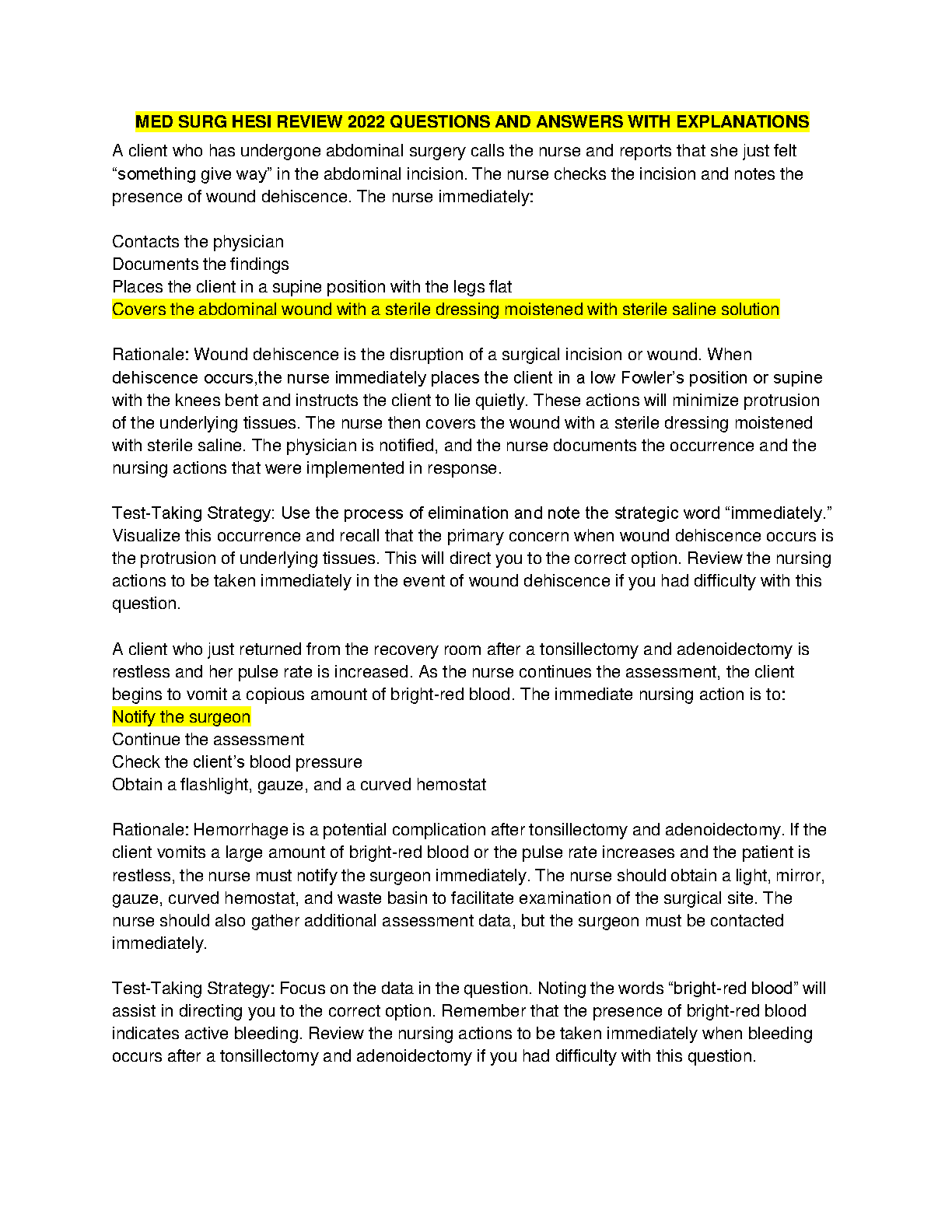 MED SURG HESI REVIEW QUESTIONS AND ANSWERS WITH EXPLANATIONS 2023. GRADED A+