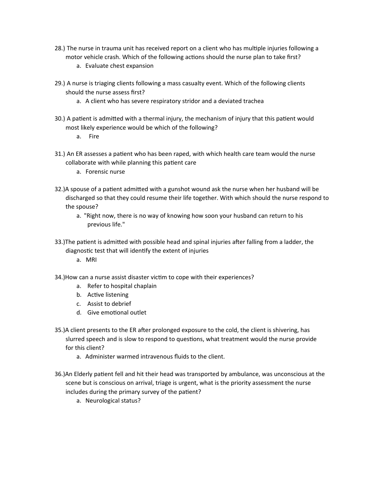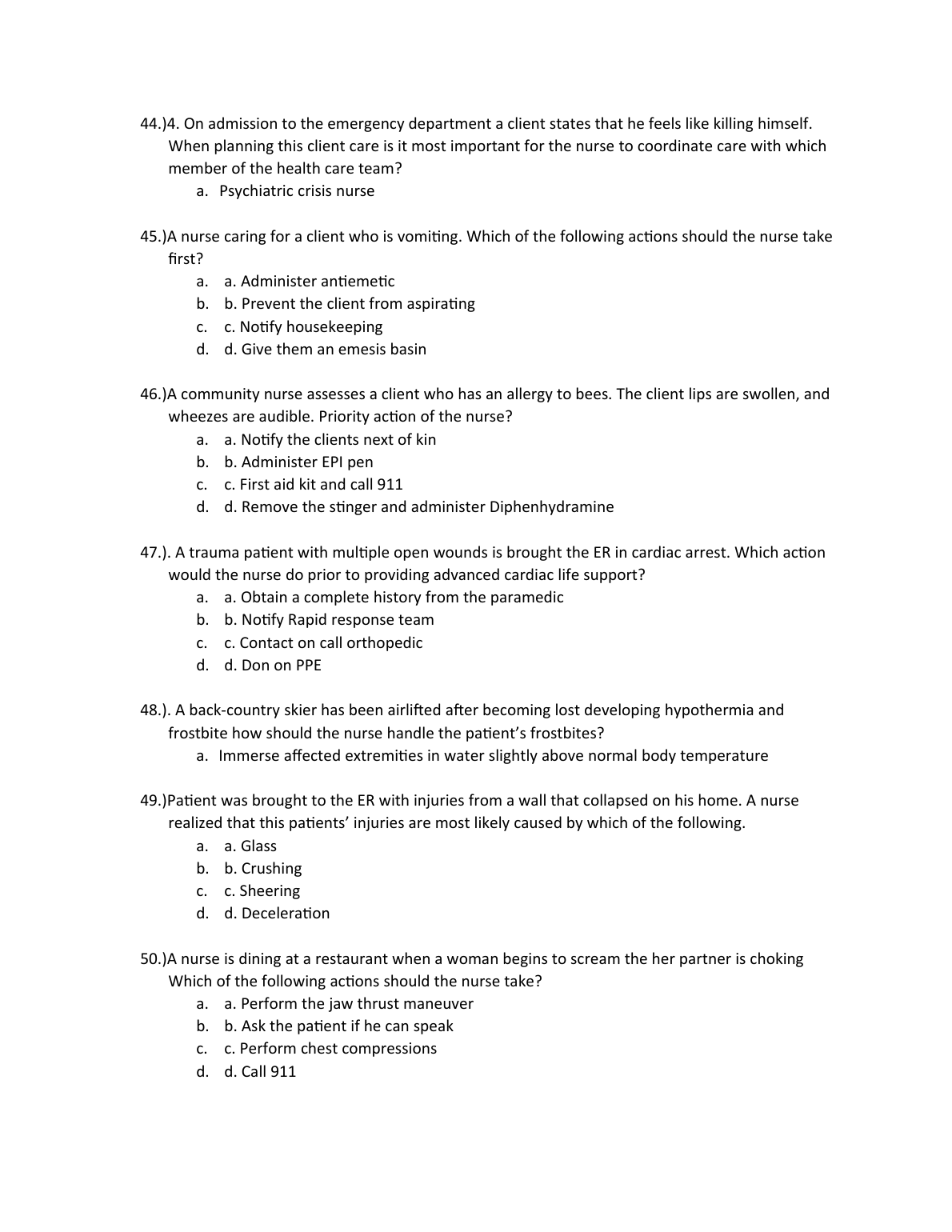 ATI MED SURG PROCTORED EXAM 2019 RETAKE WITH NGN Questions and Answers (Verified Answers) GRADED A UPDATED 2023 ATI MISC MED SURG PROCTORED 2023 EXAM QUESTIONS AND HIGHLIGHTED ANSWERS GRADED 1. The nurse is providing a complete bed bath to a patient using a commercial bath cleansing pack (bag bath). What should the nurse do? a. Rinse thoroughly. b. Allow the skin to air-dry. c. Do not use a bath towel. d. Dry the skin with a towel. ANS: B The nurse should allow the skin to air-dry for 30 seconds. Drying the skin with a towel removes the emollient that is left behind after the water/cleanser solution evaporates. It is permissible to lightly cover the patient with a bath blanket or towel to prevent chilling. Do not rinse when using a bag bath. 2. A nurse is providing perineal care to a female patient. Which washing technique will the nurse use? a. Back to front b. In a circular motion c. From pubic area to rectum d. Upward from rectum to pubic area ANS: C Cleansing from pubic area to rectum (front to back) reduces the transfer of microorganisms to the urinary meatus and decreases the risk of urinary tract infection. Cleansing from rectum to pubic area or back to front increases the risk of urinary tract infection. Circular motions are used in male perineal care. 3. The nurse is providing perineal care to an uncircumcised male patient. Which action will the nurse take? a. Leave the foreskin alone because there is little chance of infection. 1 b. Retract the foreskin for cleansing and allow it to return on its own. c. Retract the foreskin and return it to its natural position when done. d. Leave the foreskin retracted. ANS: C Return the foreskin to its natural position. Keeping the foreskin retracted leads to tightening of the foreskin around the shaft of the penis, causing local edema and discomfort. The foreskin may not return to its natural position on its own. Patients at greatest risk for infection are uncircumcised males. 4. Which instruction will the nurse provide to the nursing assistive personnel when providing foot care for a patient with diabetes? a. Do not place slippers on the patient’s feet. b. Trim the patient’s toenails daily. c. Report sores on the patient’s toes. d. Check the brachial artery. ANS: C Report any changes that may indicate inflammation or injury to tissue. Do not allow the diabetic patient to go barefoot; injury can lead to amputations. Clipping toenails is not allowed. Patients with peripheral vascular disease or diabetes mellitus often require nail care from a specialist to reduce the risk of infection. When assessing the patient’s feet, the nurse palpates the dorsalis pedis of the foot, not the brachial artery. 5. The debilitated patient is resisting attempts by the nurse to provide oral hygiene. Which action will the nurse take next? a. Insert an oral airway. b. Place the patient in a flat, supine position. c. Use undiluted hydrogen peroxide as a cleaner. d. Quickly proceed while not talking to the patient. ATI MED SURG PROCTORED EXAM. QUESTIONS AND ANSWERS. GRADED A+ 2023 ATI MED SURG PROCTORED EXAM 2019 RETAKE WITH NGN (WITH CORRECT QUESTIONS AND ANSWERS GRADED A )UPDATED 2023 BRAND NEW WITH RATIONALES ATI RN MED SURG PROCTORED EXAM 2023 QUESTIONS WITH CORRECT AND VERIFIED ANSWERS ALREADY GRADED A .